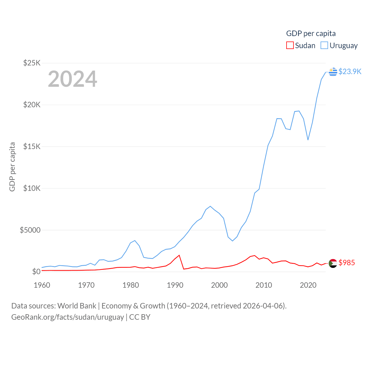 By GDP, Sudan ranks 94/197 ($49.7B) and Uruguay ranks 81/197 ($81B). By GDP per capita, Sudan ranks 179/197 ($985), while Uruguay ranks 52/197 ($23,907).