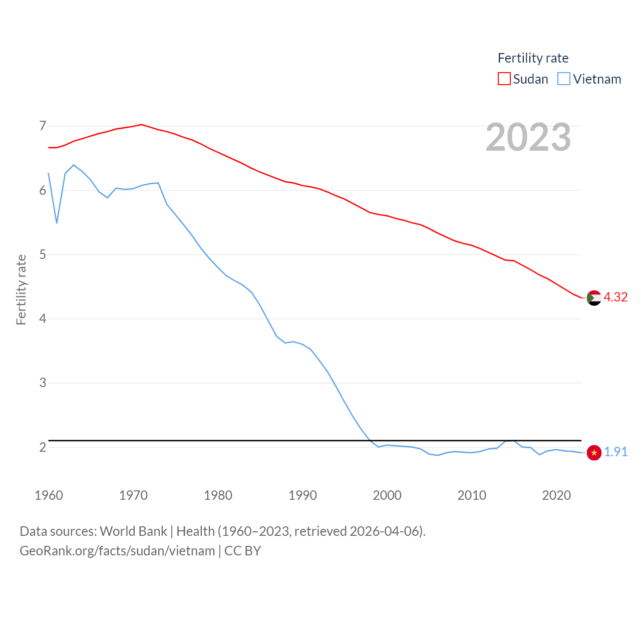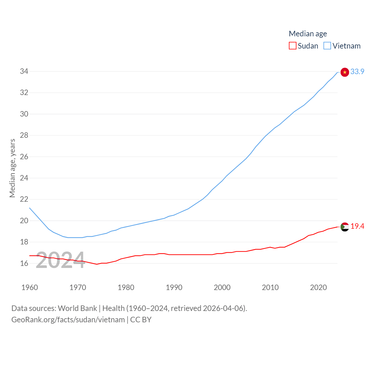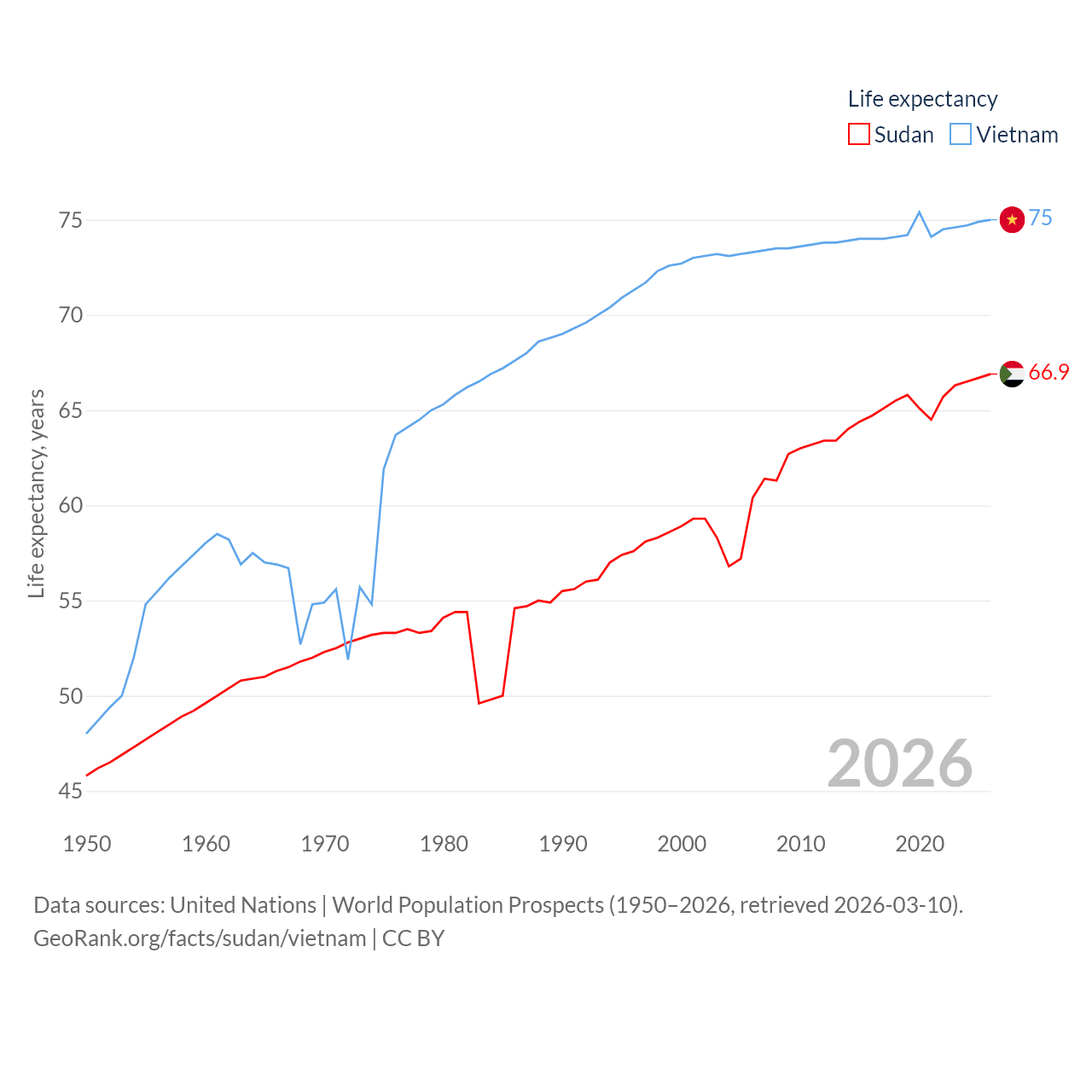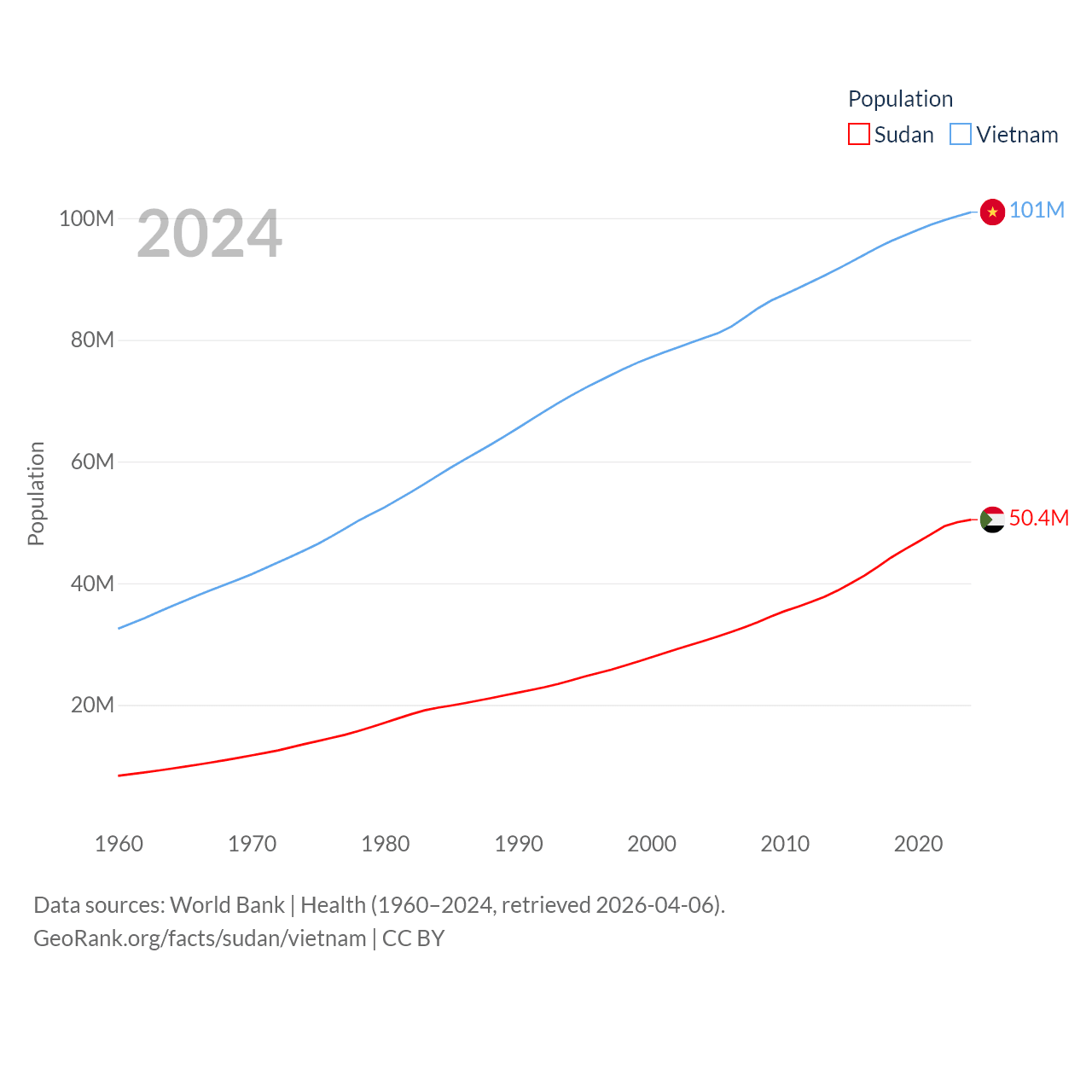 Sudan has a population of 50.4M (ranked 30/197), compared with 101M in Vietnam (ranked 16/197). Sudan's land area is 721,239 sq mi versus 121,016 sq mi for Vietnam (ranked 15th vs. 67th).