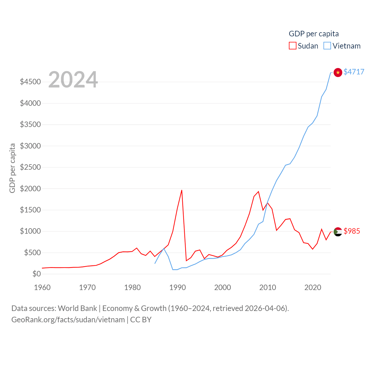 By GDP, Sudan ranks 94/197 ($49.7B) and Vietnam ranks 33/197 ($476B). By GDP per capita, Sudan ranks 179/197 ($985), while Vietnam ranks 122/197 ($4,717).
