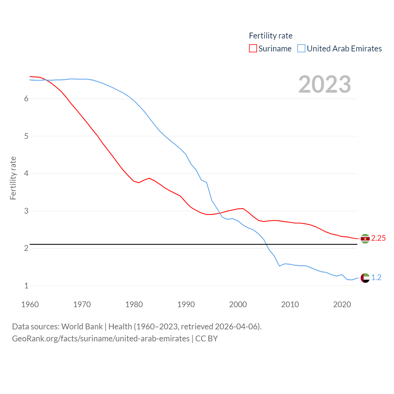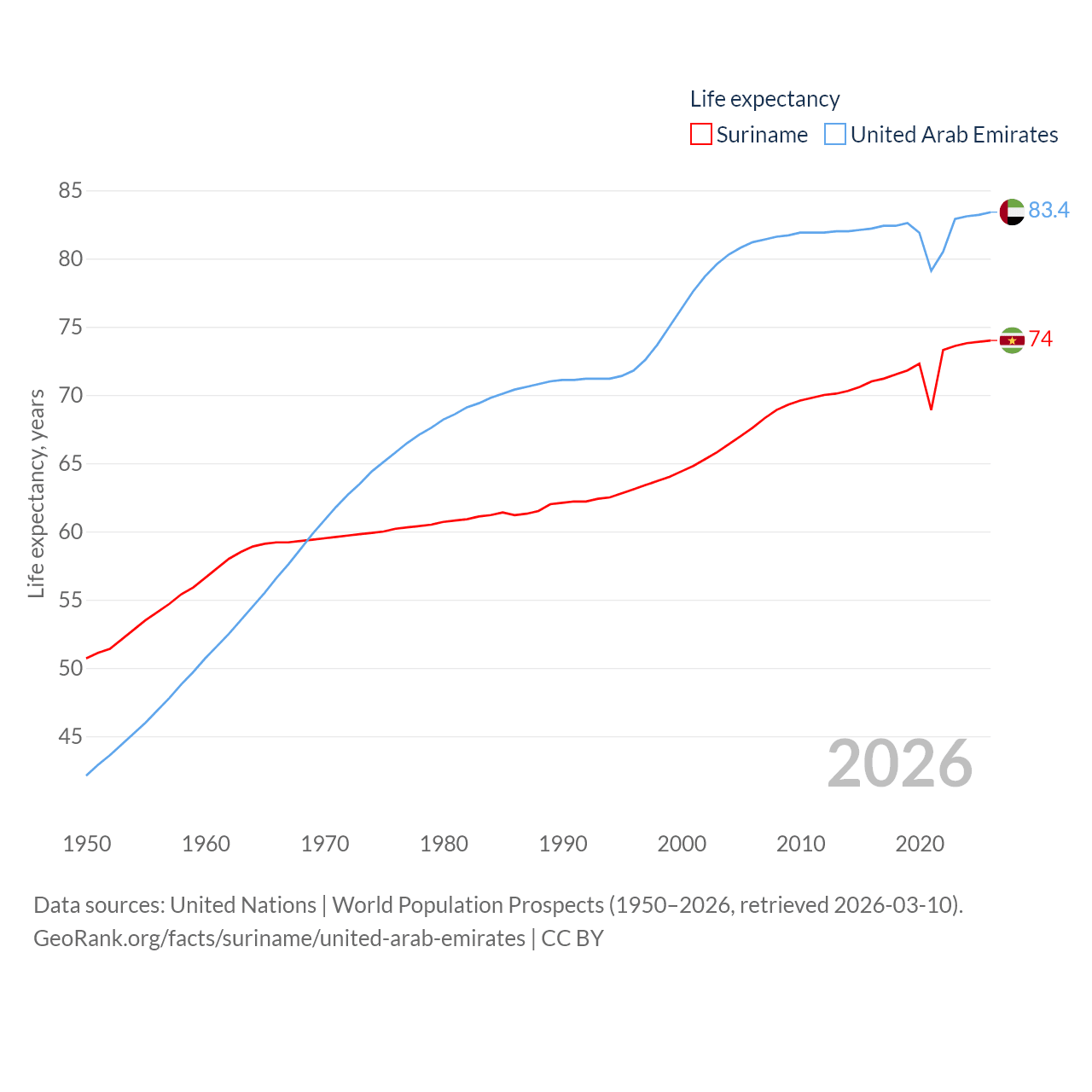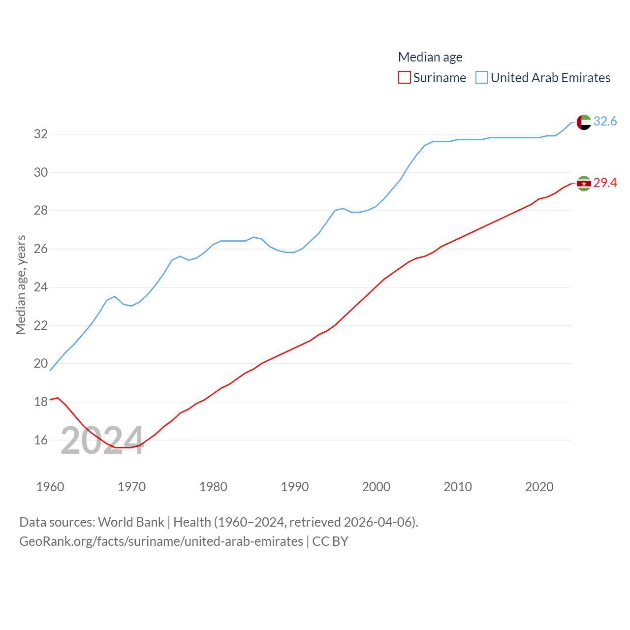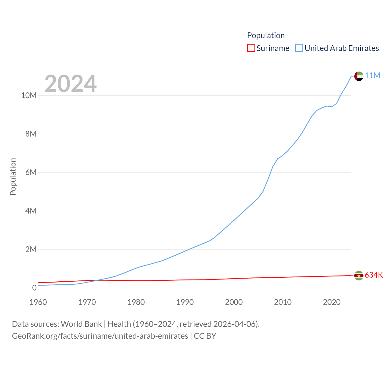 Suriname has a population of 634K (ranked 165/197), compared with 11M in The United Arab Emirates (ranked 86/197). Suriname's land area is 61,972 sq mi versus 27,421 sq mi for The United Arab Emirates (ranked 90th vs. 117th).