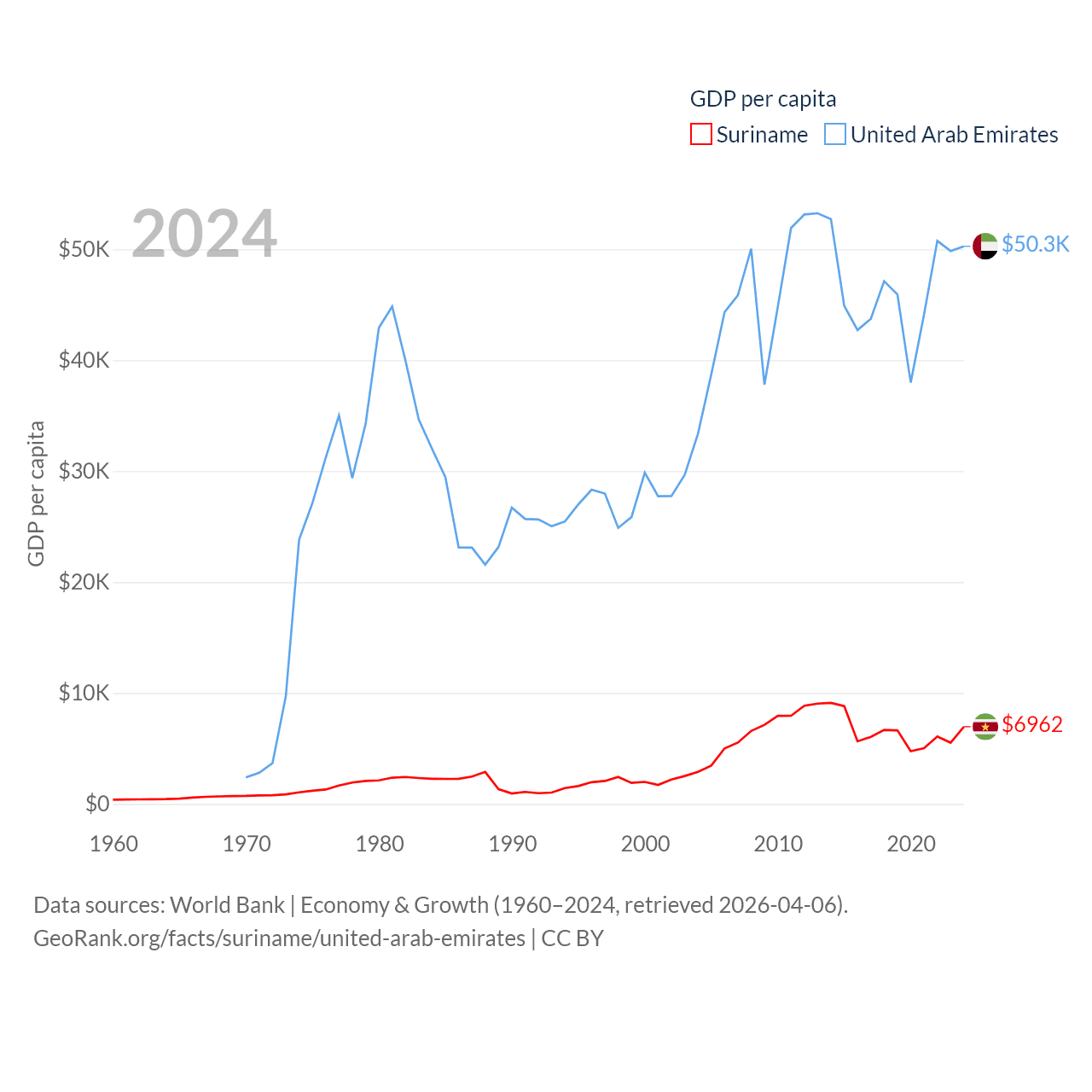 By GDP, Suriname ranks 164/197 ($4.42B) and The United Arab Emirates ranks 27/197 ($552B). By GDP per capita, Suriname ranks 102/197 ($6,962), while The United Arab Emirates ranks 24/197 ($50,274).
