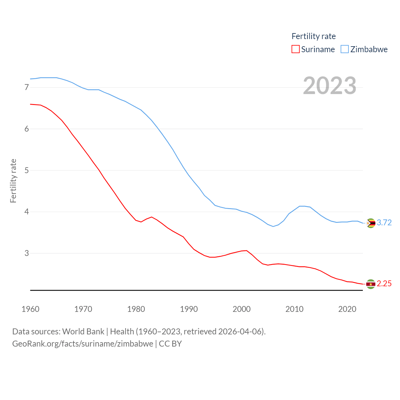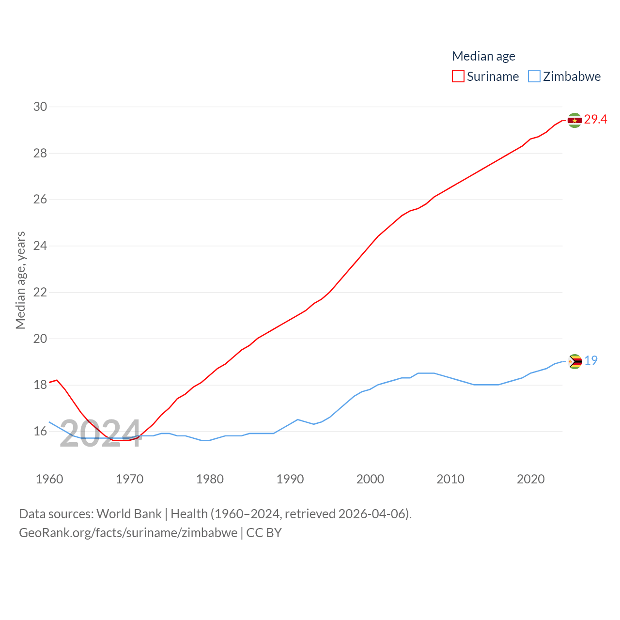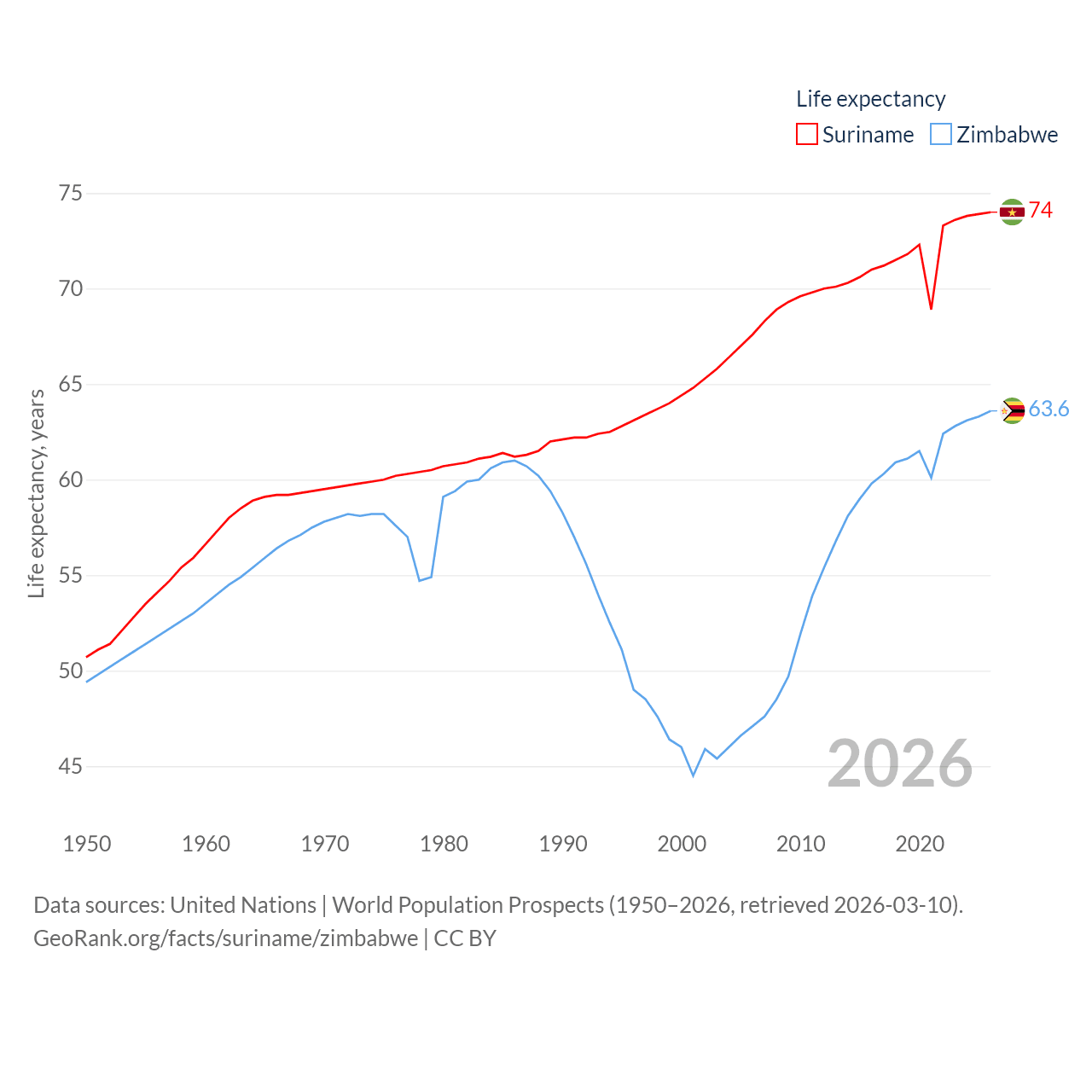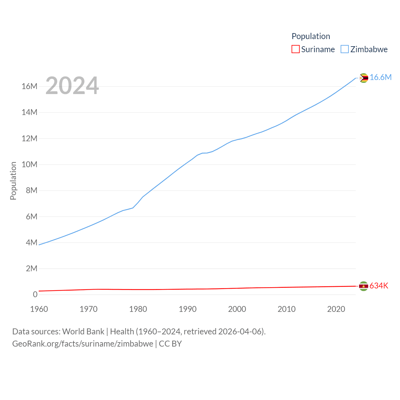 Suriname has a population of 634K (ranked 165/197), compared with 16.6M in Zimbabwe (ranked 74/197). Suriname's land area is 61,972 sq mi versus 149,364 sq mi for Zimbabwe (ranked 90th vs. 60th).