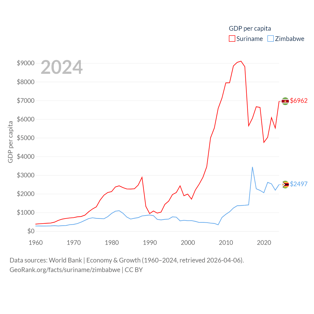 By GDP, Suriname ranks 164/197 ($4.42B) and Zimbabwe ranks 102/197 ($41.5B). By GDP per capita, Suriname ranks 102/197 ($6,962), while Zimbabwe ranks 148/197 ($2,497).