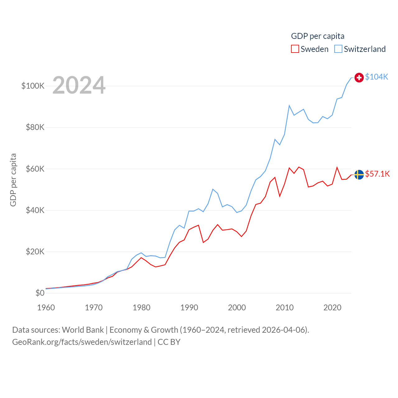 By GDP, Sweden ranks 26/197 ($604B) and Switzerland ranks 20/197 ($937B). By GDP per capita, Sweden ranks 17/197 ($57,117), while Switzerland ranks 5/197 ($103,998).