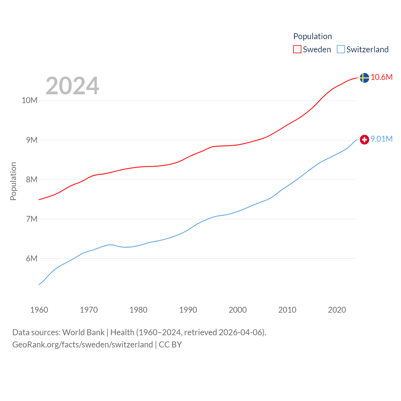 Sweden has a population of 10.6M (ranked 93/197), compared with 9.01M in Switzerland (ranked 101/197). Sweden's land area is 157,248 sq mi versus 15,255 sq mi for Switzerland (ranked 58th vs. 131st).