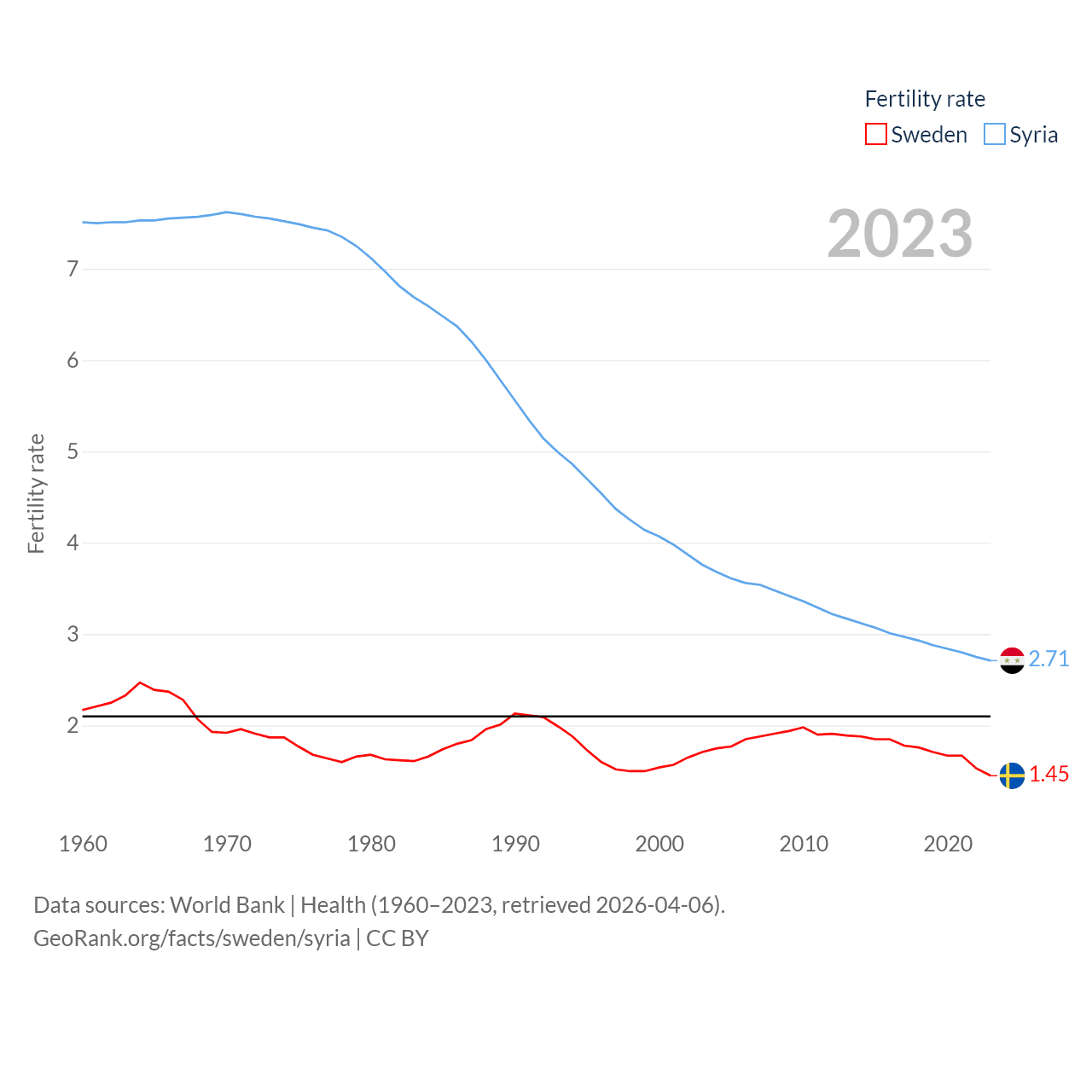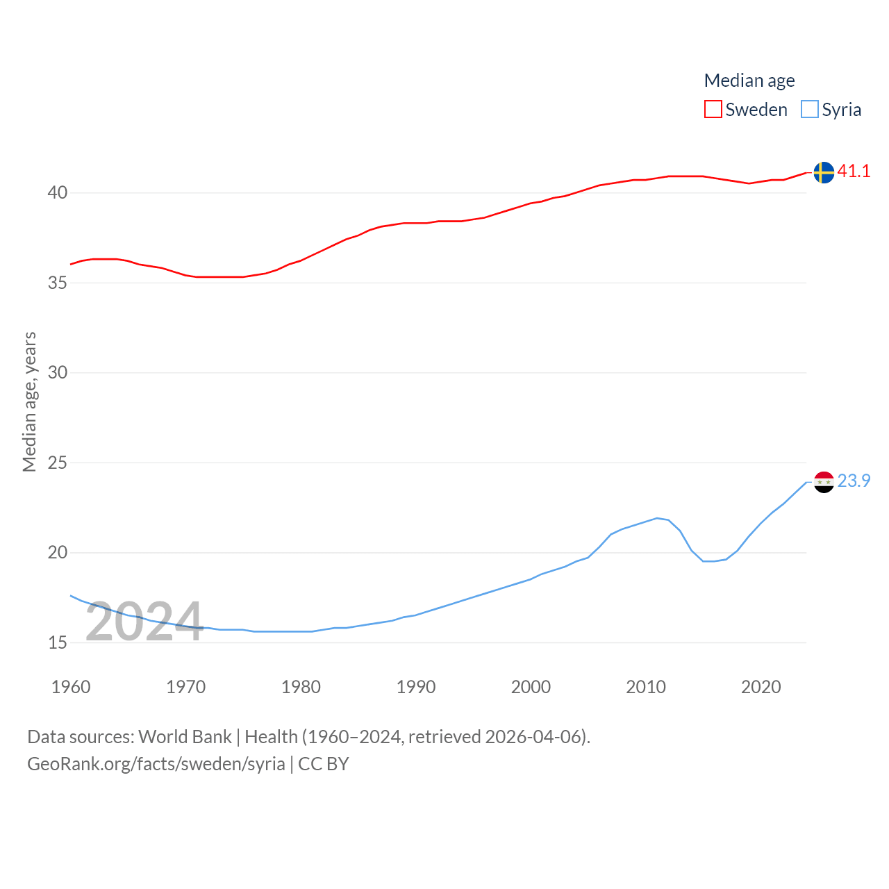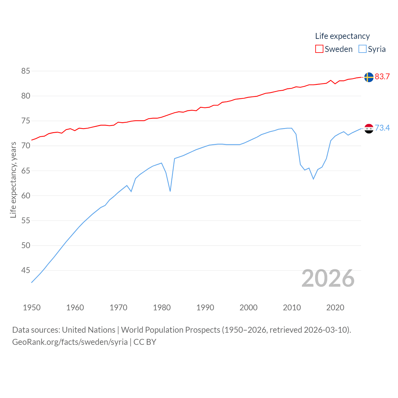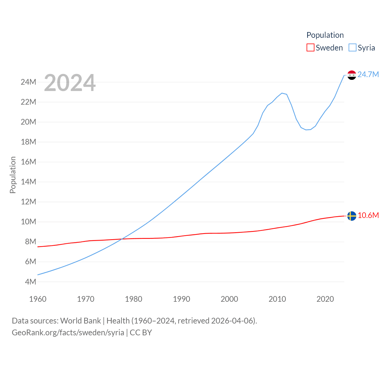 Sweden has a population of 10.6M (ranked 93/197), compared with 24.7M in Syria (ranked 57/197). Sweden's land area is 157,248 sq mi versus 70,900 sq mi for Syria (ranked 58th vs. 87th).