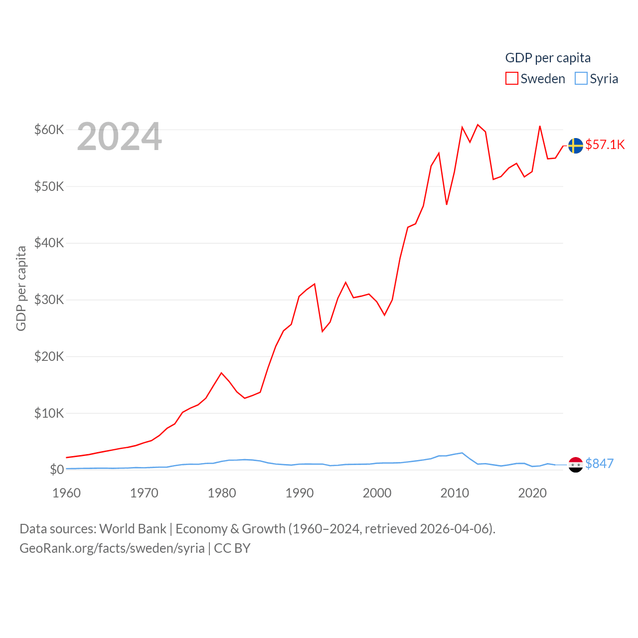 By GDP, Sweden ranks 26/197 ($604B) and Syria ranks 129/197 ($20B). By GDP per capita, Sweden ranks 17/197 ($57,117), while Syria ranks 185/197 ($847).