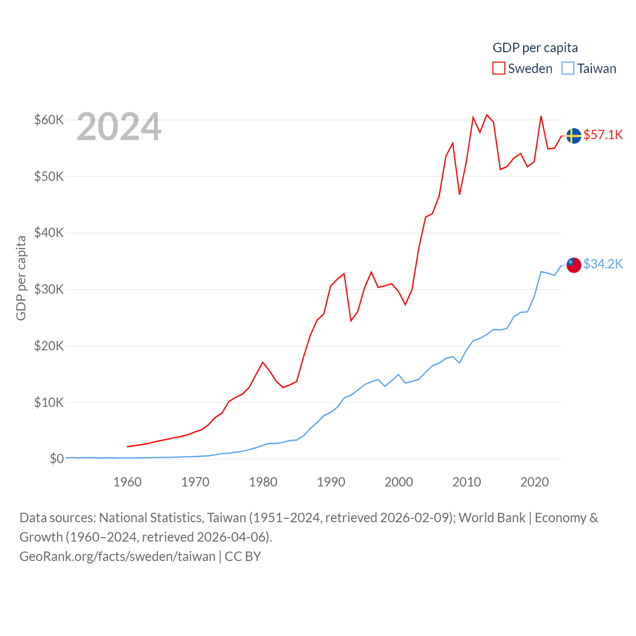 By GDP, Sweden ranks 26/197 ($604B) and Taiwan ranks 22/197 ($802B). By GDP per capita, Sweden ranks 17/197 ($57,117), while Taiwan ranks 35/197 ($34,238).