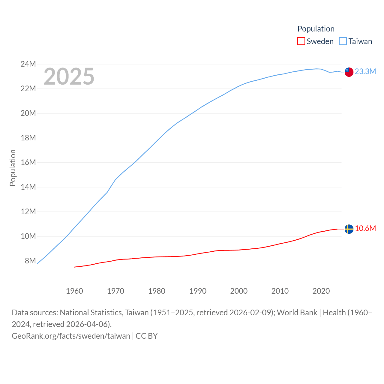 Sweden has a population of 10.6M (ranked 93/197), compared with 23.3M in Taiwan (ranked 60/197). Sweden's land area is 157,248 sq mi versus 13,976 sq mi for Taiwan (ranked 58th vs. 133rd).
