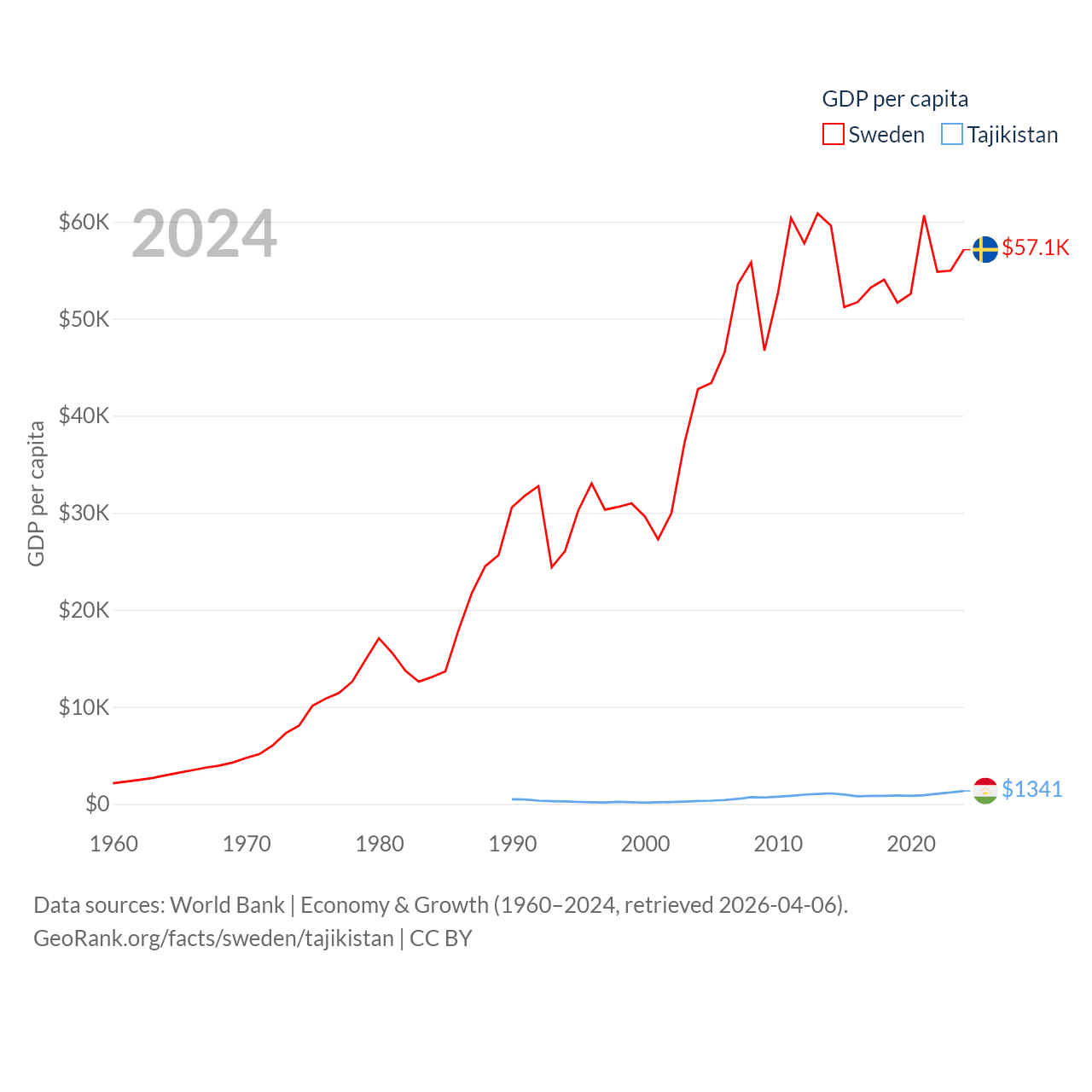 By GDP, Sweden ranks 26/197 ($604B) and Tajikistan ranks 145/197 ($14.2B). By GDP per capita, Sweden ranks 17/197 ($57,117), while Tajikistan ranks 166/197 ($1,341).