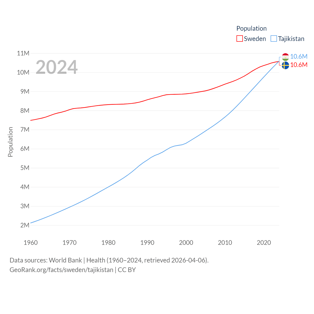Sweden has a population of 10.6M (ranked 93/197), compared with 10.6M in Tajikistan (ranked 91/197). Sweden's land area is 157,248 sq mi versus 53,587 sq mi for Tajikistan (ranked 58th vs. 93rd).