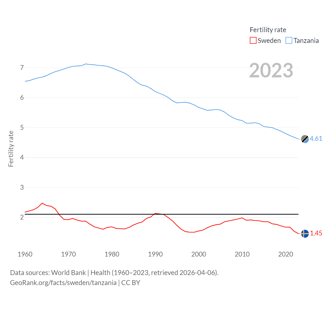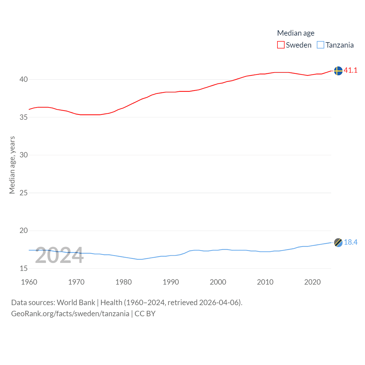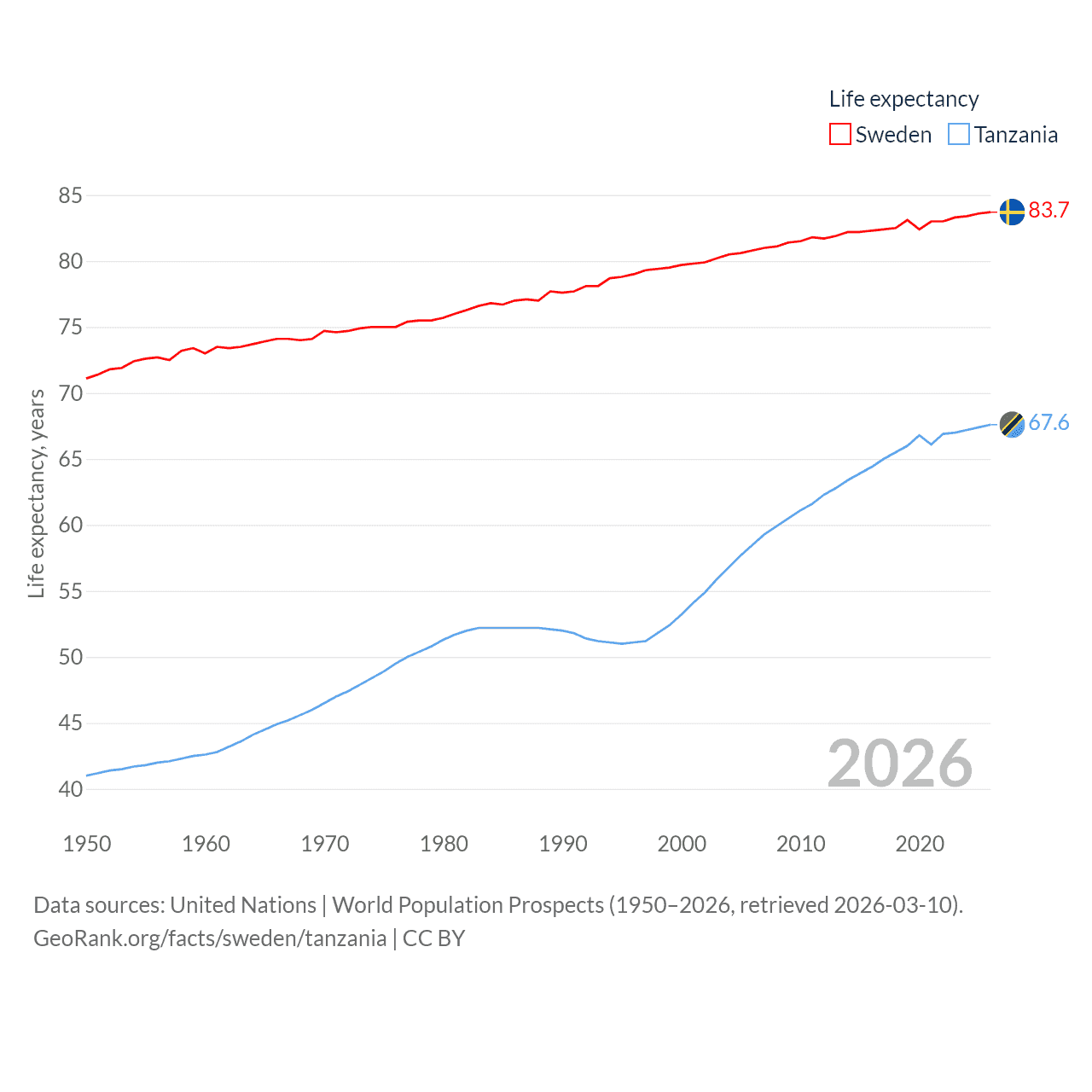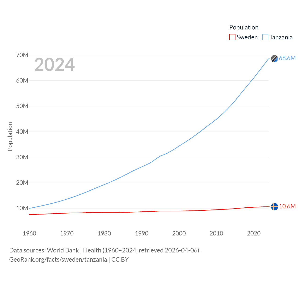 Sweden has a population of 10.6M (ranked 93/197), compared with 68.6M in Tanzania (ranked 22/197). Sweden's land area is 157,248 sq mi versus 342,009 sq mi for Tanzania (ranked 58th vs. 31st).