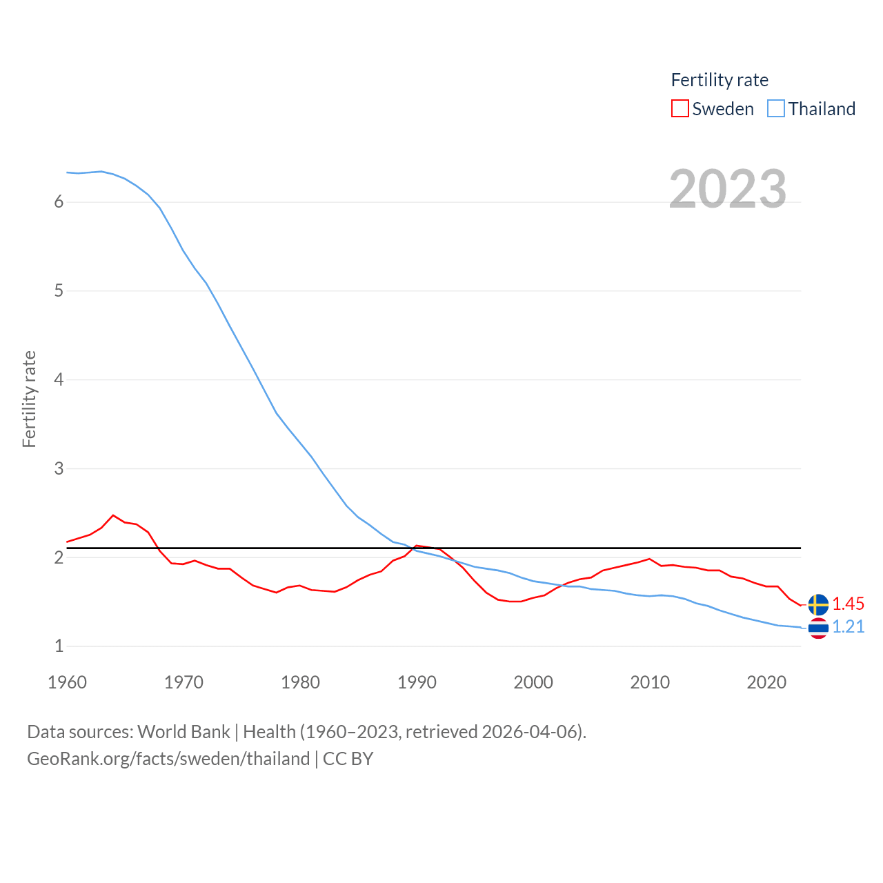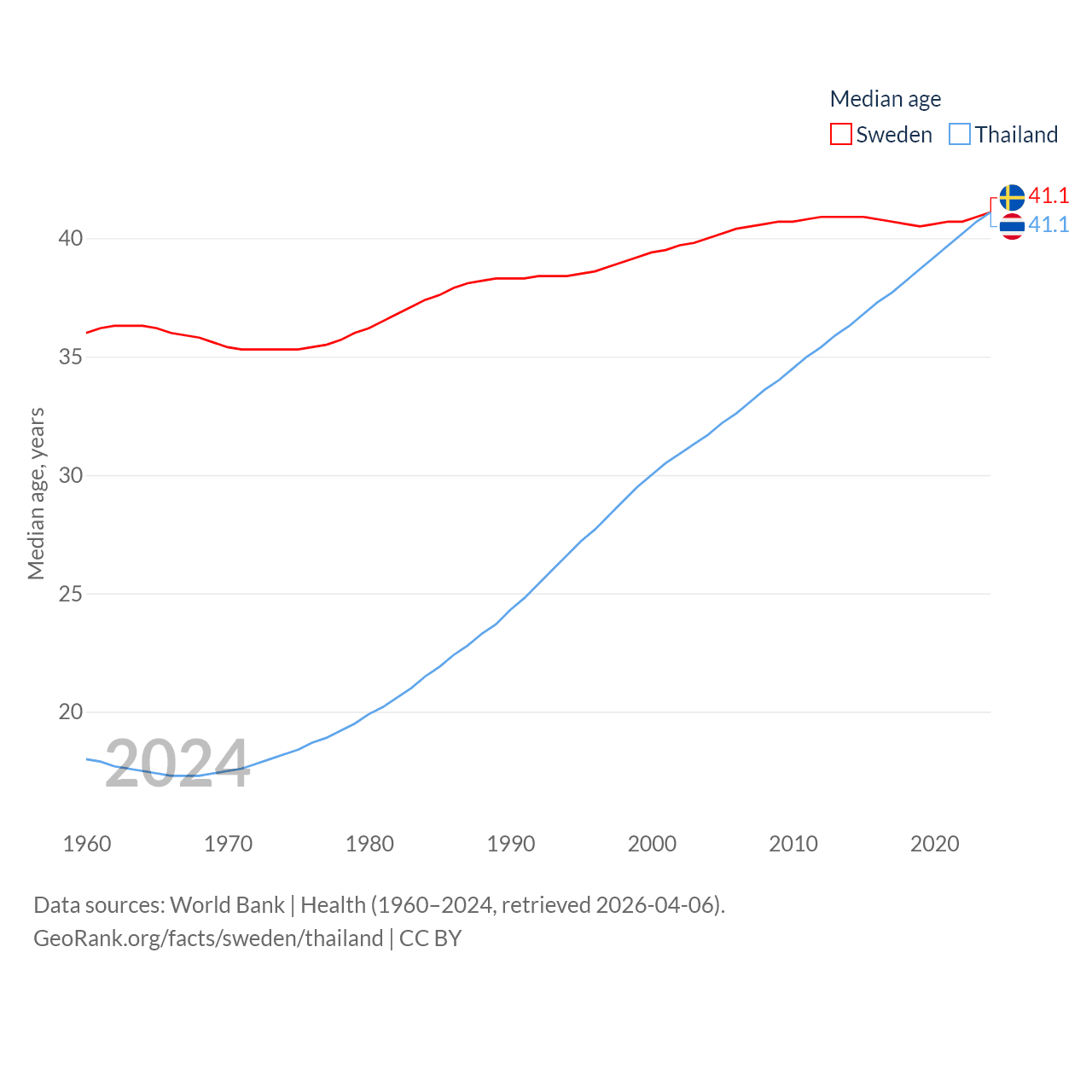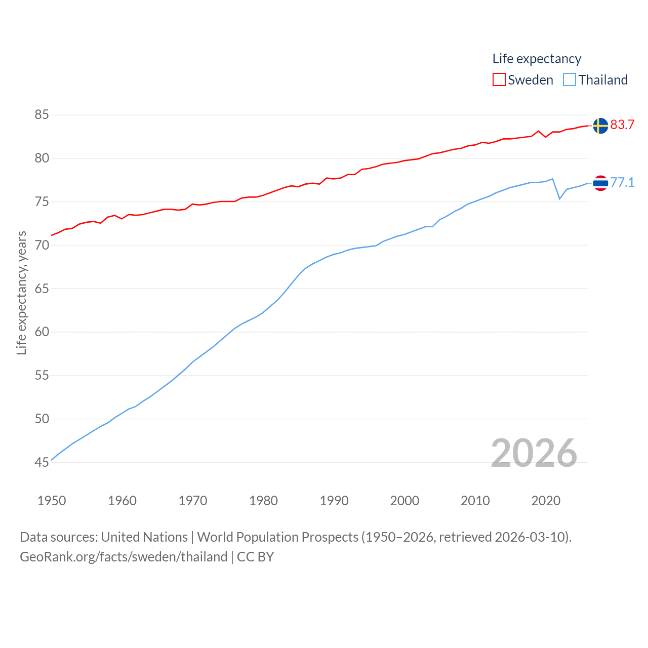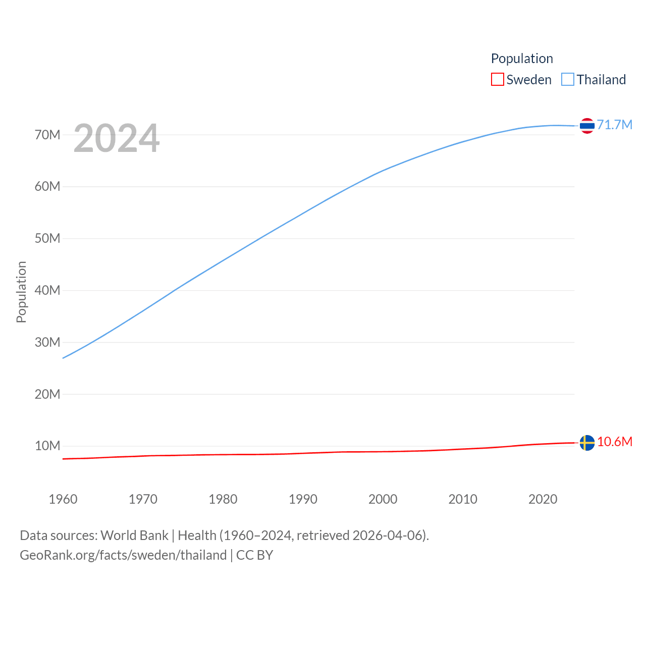 Sweden has a population of 10.6M (ranked 93/197), compared with 71.7M in Thailand (ranked 20/197). Sweden's land area is 157,248 sq mi versus 197,256 sq mi for Thailand (ranked 58th vs. 50th).