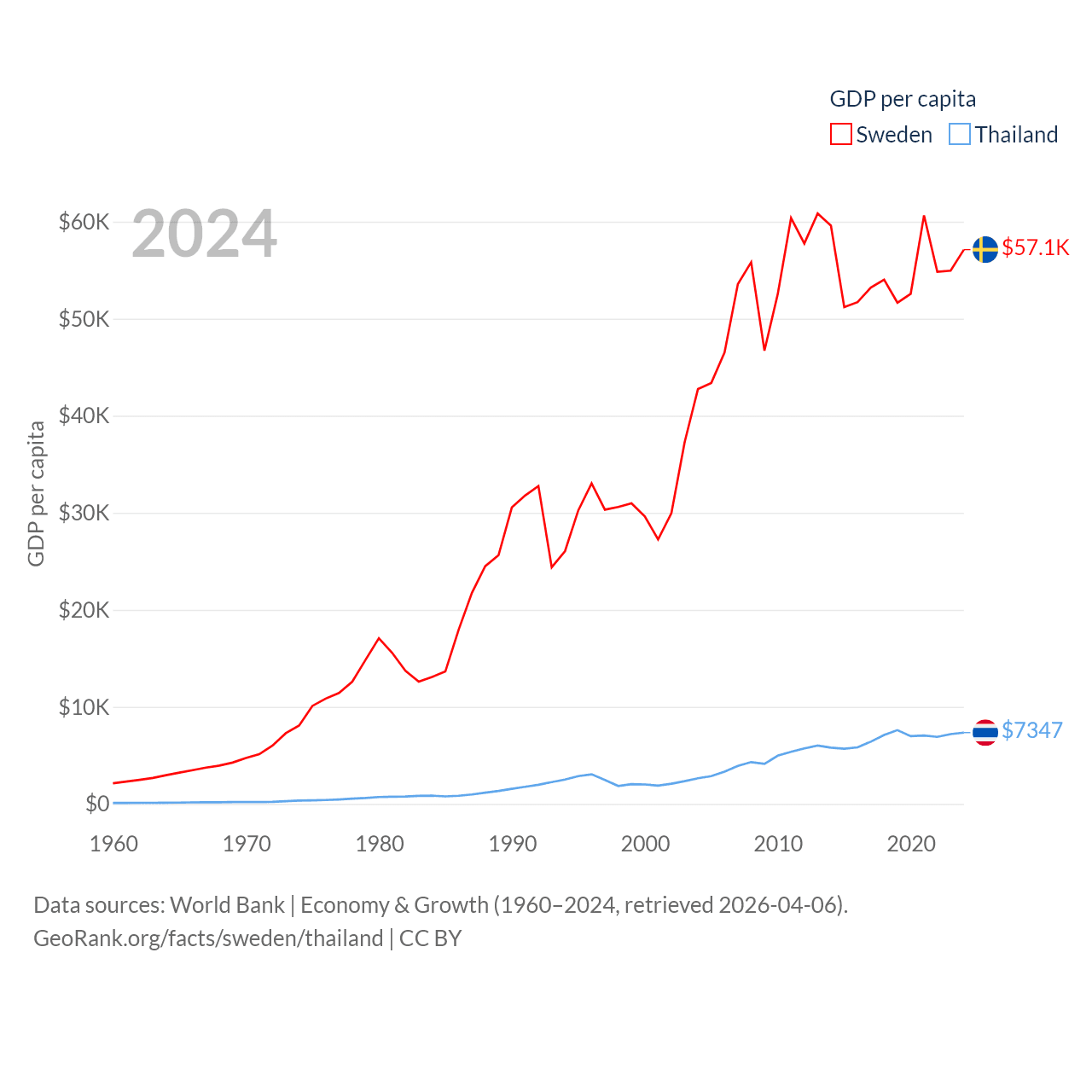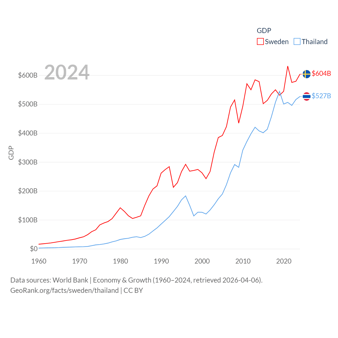 By GDP, Sweden ranks 26/197 ($604B) and Thailand ranks 31/197 ($527B). By GDP per capita, Sweden ranks 17/197 ($57,117), while Thailand ranks 100/197 ($7,347).