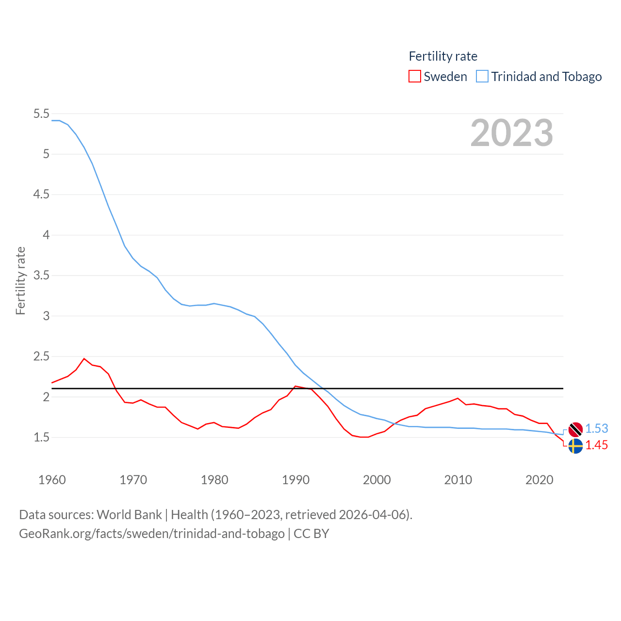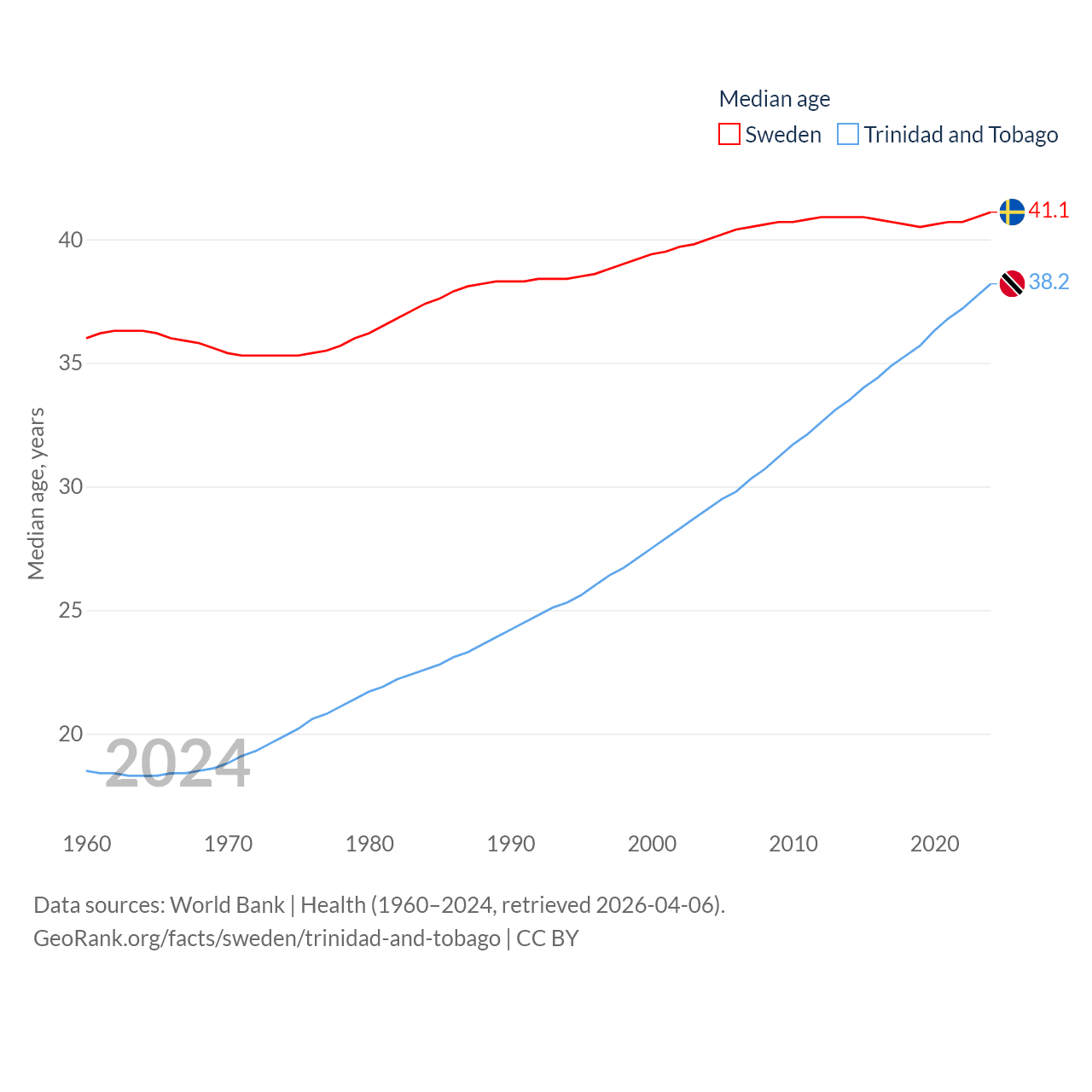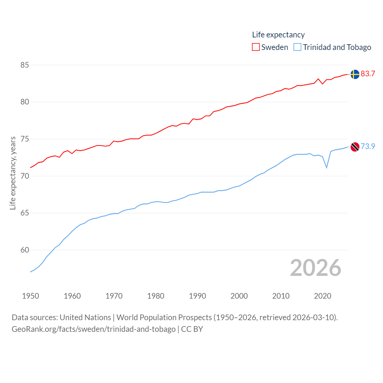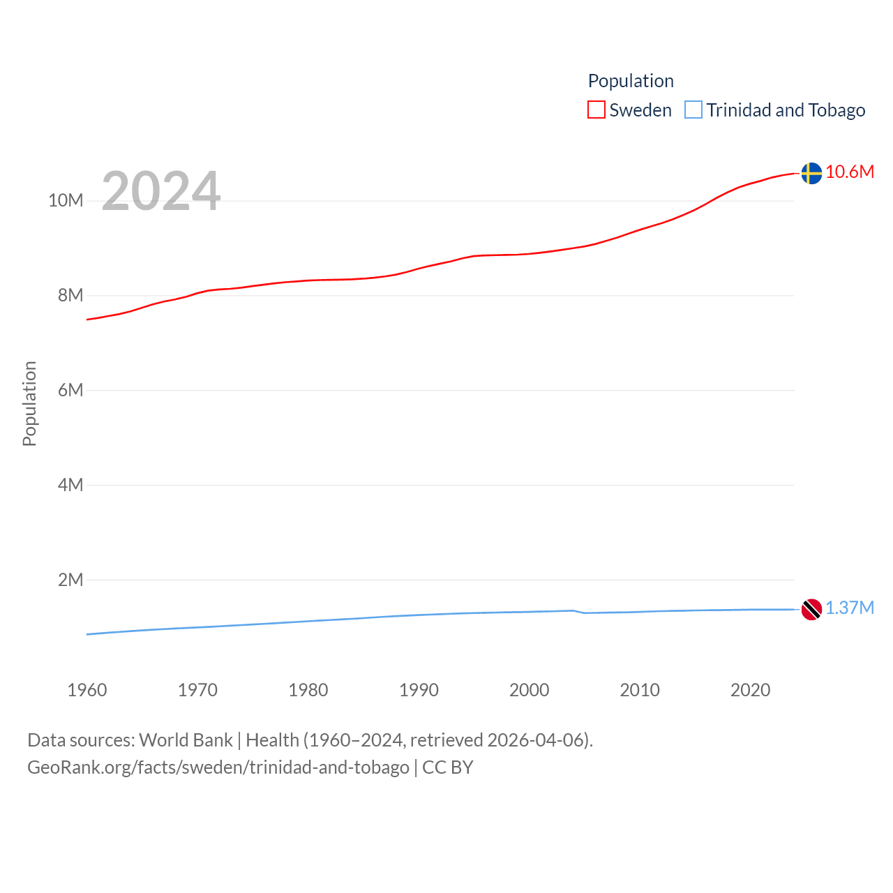 Sweden has a population of 10.6M (ranked 93/197), compared with 1.37M in Trinidad and Tobago (ranked 154/197). Sweden's land area is 157,248 sq mi versus 1,981 sq mi for Trinidad and Tobago (ranked 58th vs. 166th).