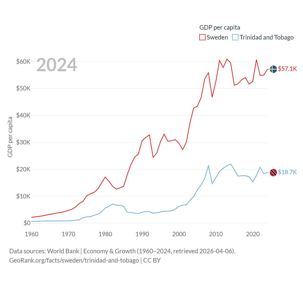 By GDP, Sweden ranks 26/197 ($604B) and Trinidad and Tobago ranks 115/197 ($25.6B). By GDP per capita, Sweden ranks 17/197 ($57,117), while Trinidad and Tobago ranks 61/197 ($18,733).