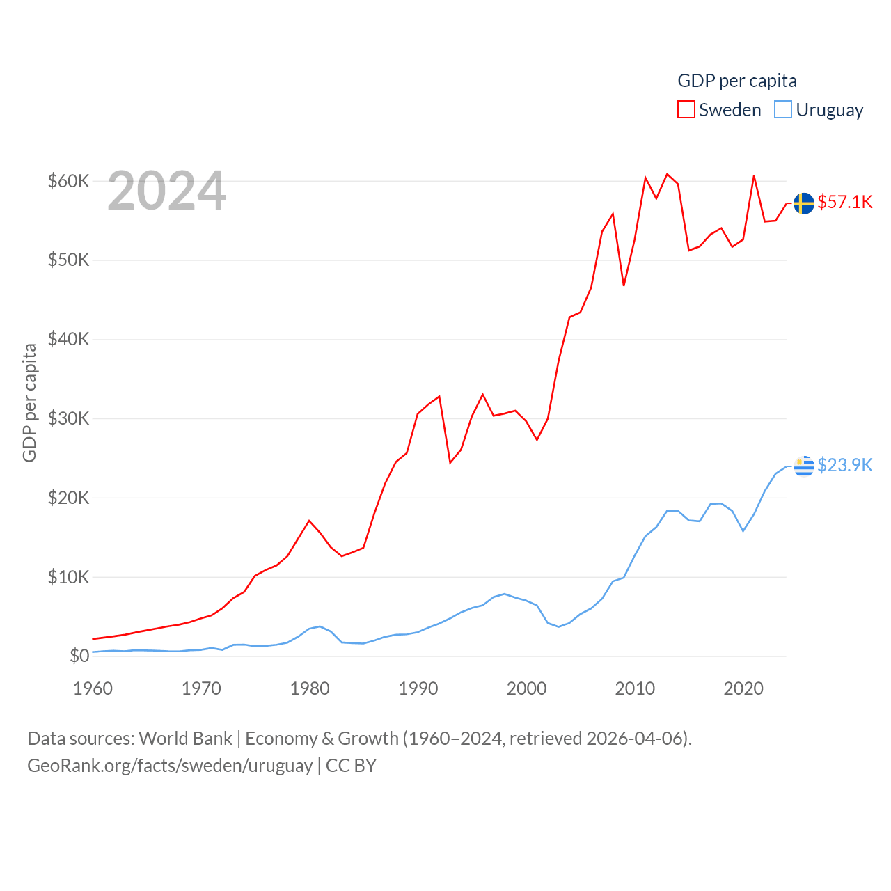 By GDP, Sweden ranks 26/197 ($604B) and Uruguay ranks 81/197 ($81B). By GDP per capita, Sweden ranks 17/197 ($57,117), while Uruguay ranks 52/197 ($23,907).