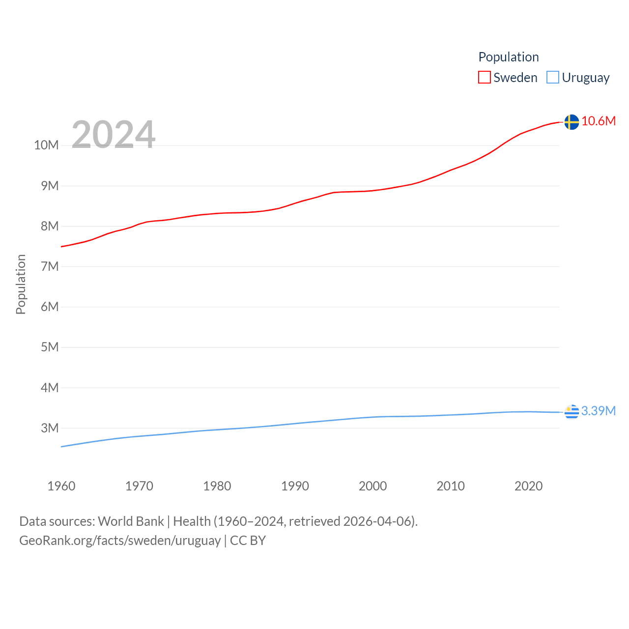 Sweden has a population of 10.6M (ranked 93/197), compared with 3.39M in Uruguay (ranked 133/197). Sweden's land area is 157,248 sq mi versus 67,576 sq mi for Uruguay (ranked 58th vs. 89th).