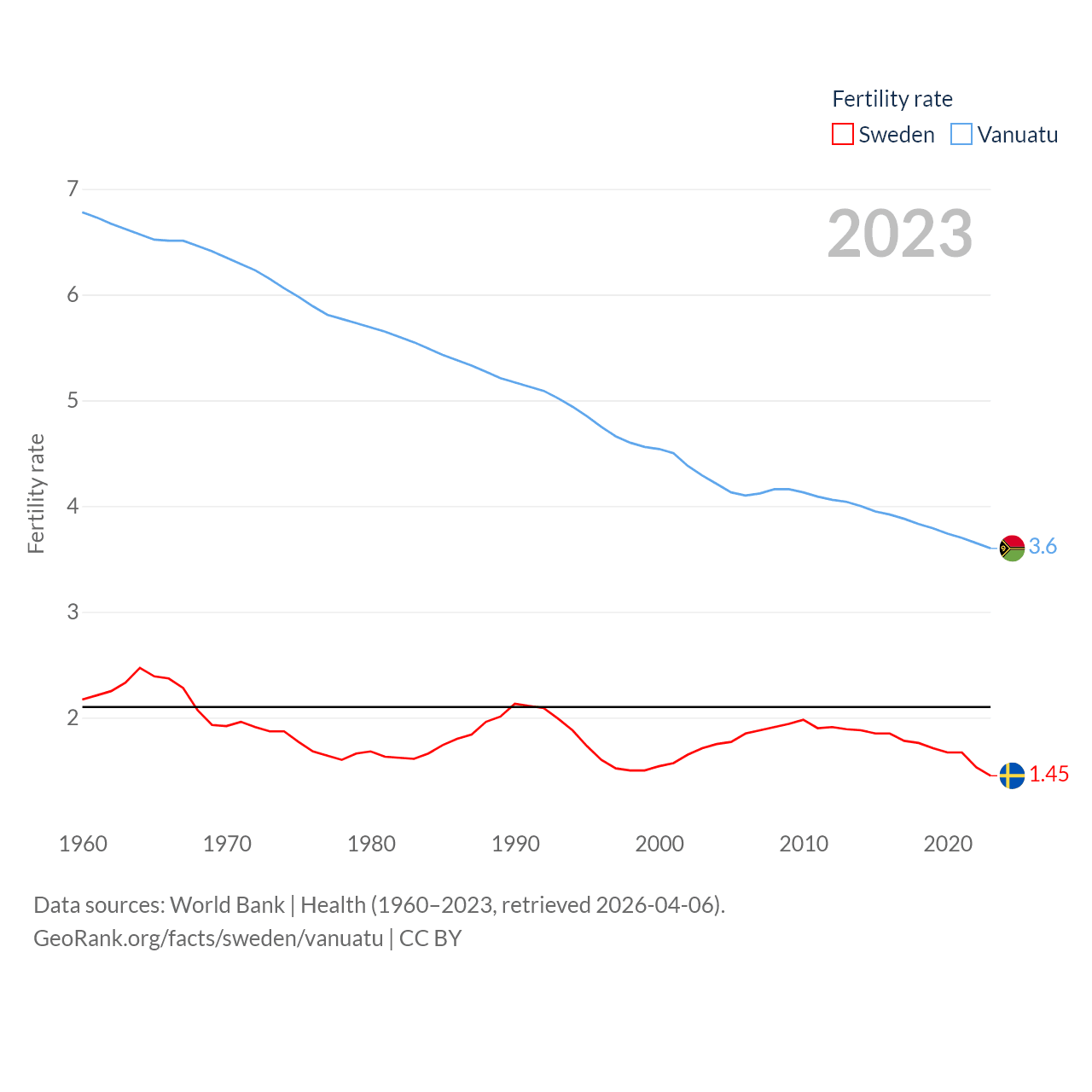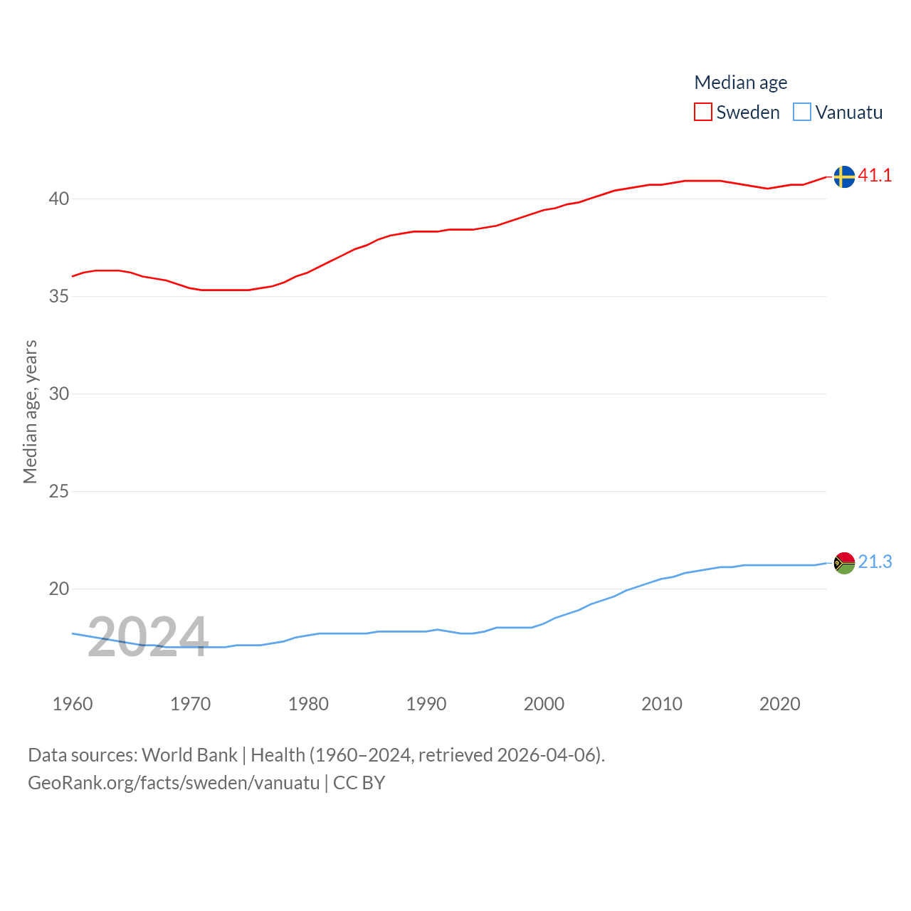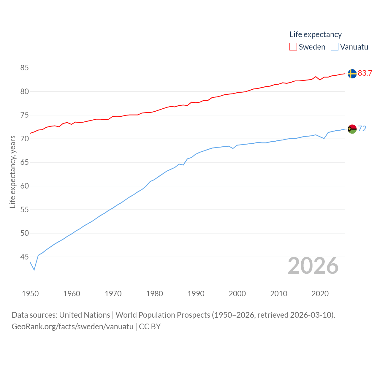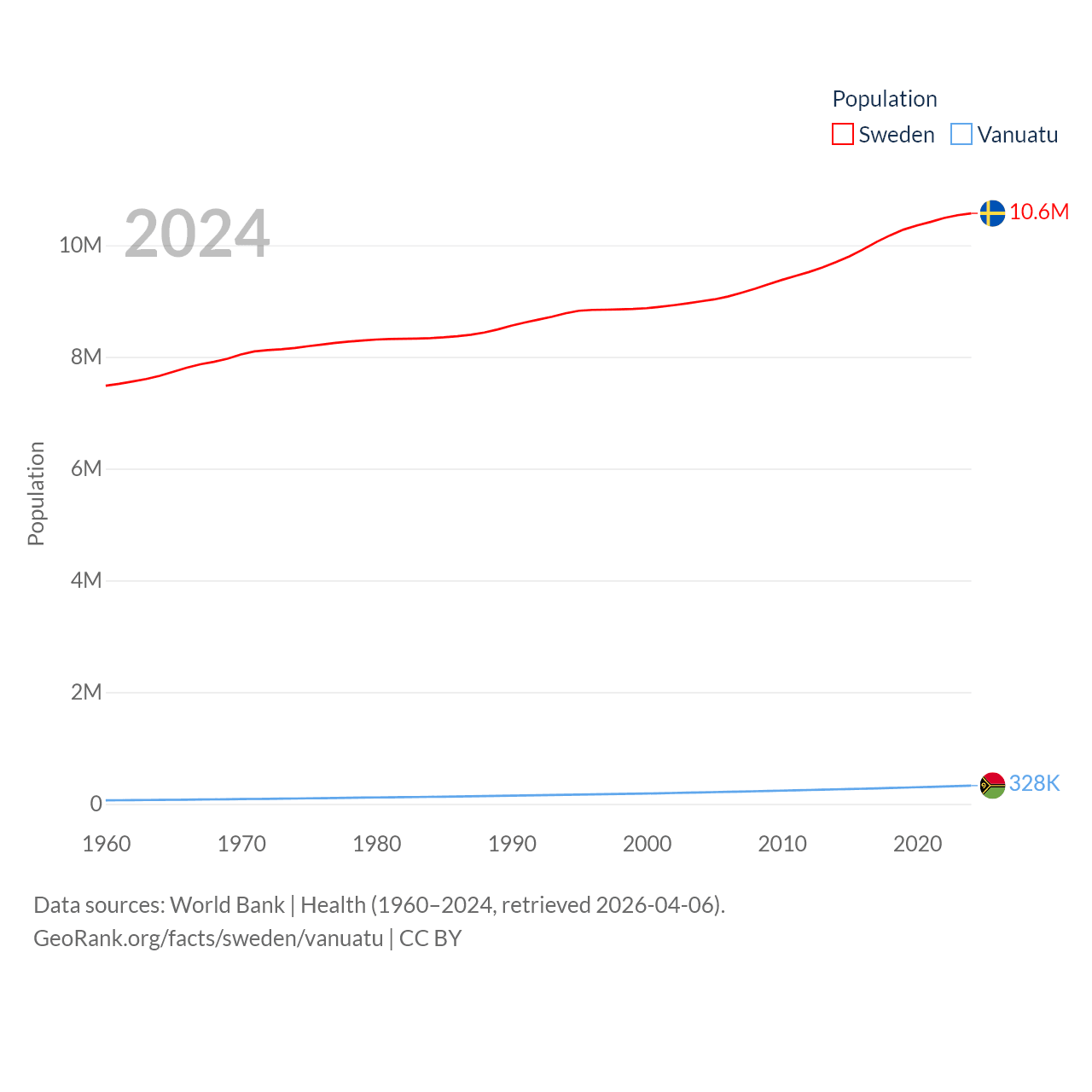 Sweden has a population of 10.6M (ranked 93/197), compared with 328K in Vanuatu (ranked 174/197). Sweden's land area is 157,248 sq mi versus 4,707 sq mi for Vanuatu (ranked 58th vs. 157th).