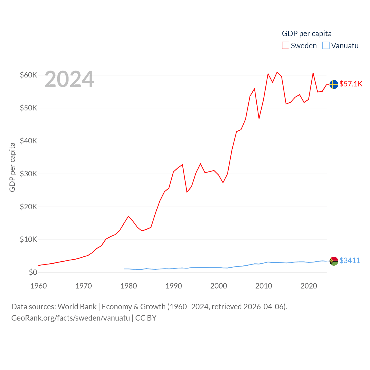 By GDP, Sweden ranks 26/197 ($604B) and Vanuatu ranks 188/197 ($1.12B). By GDP per capita, Sweden ranks 17/197 ($57,117), while Vanuatu ranks 137/197 ($3,411).