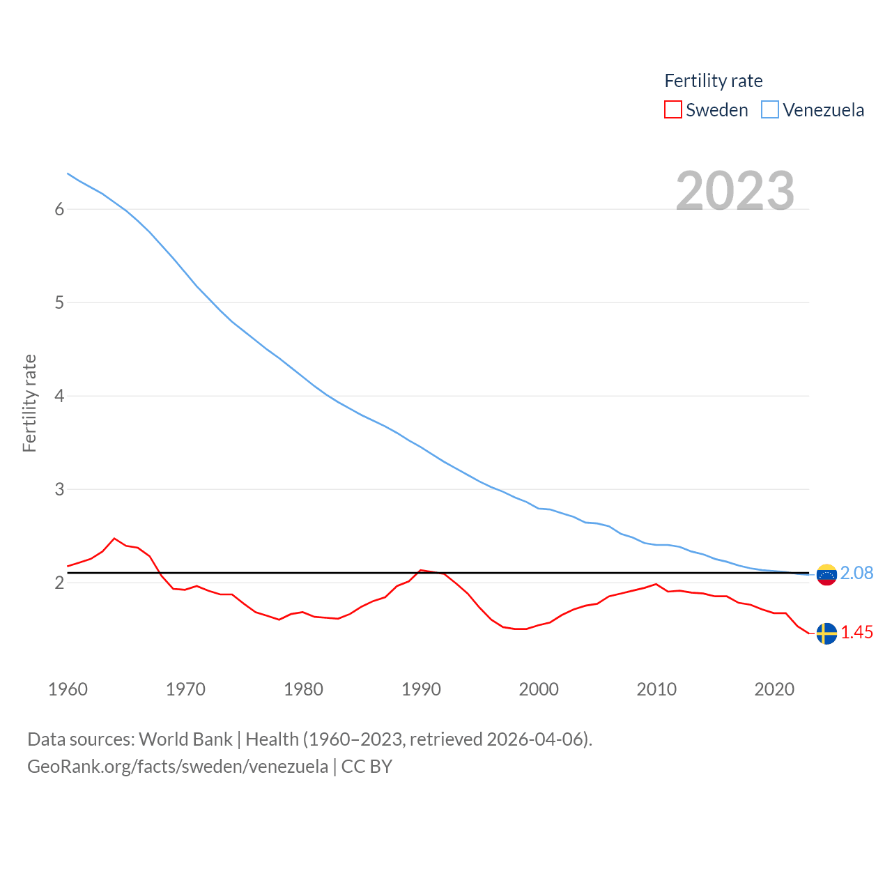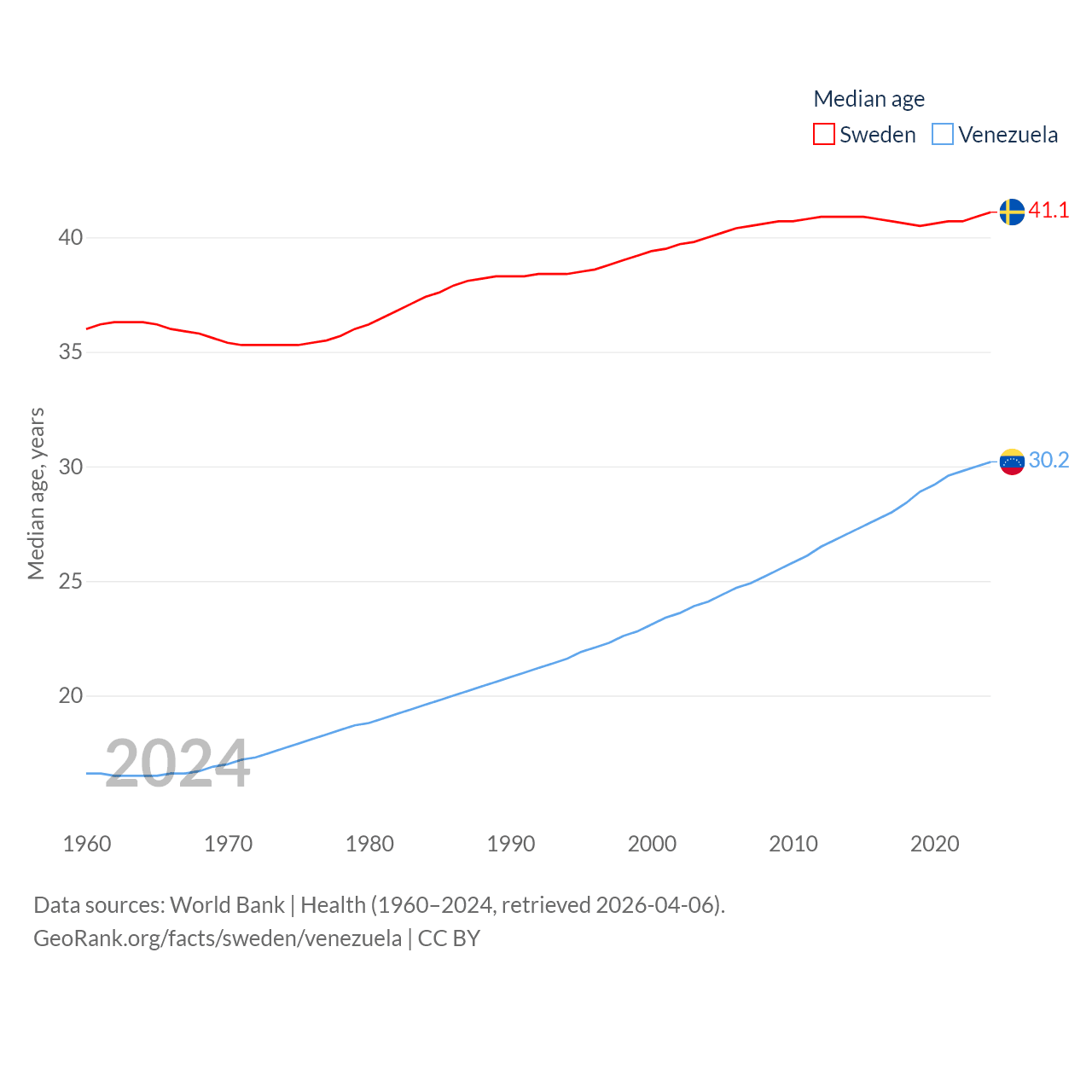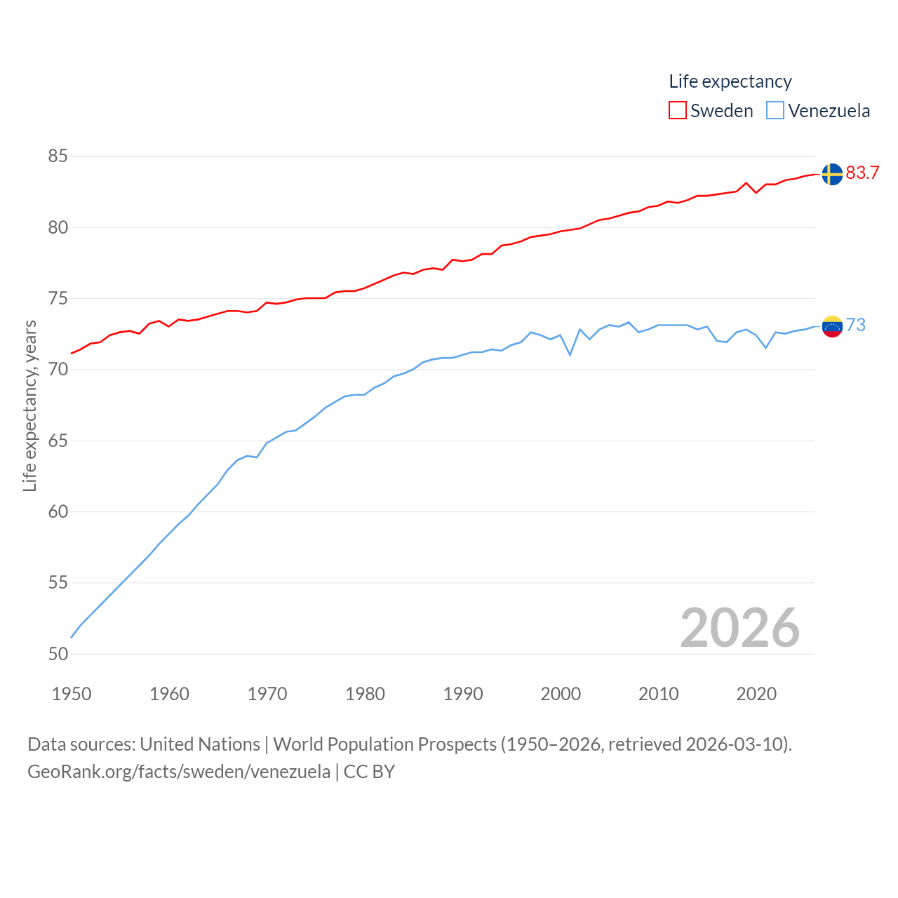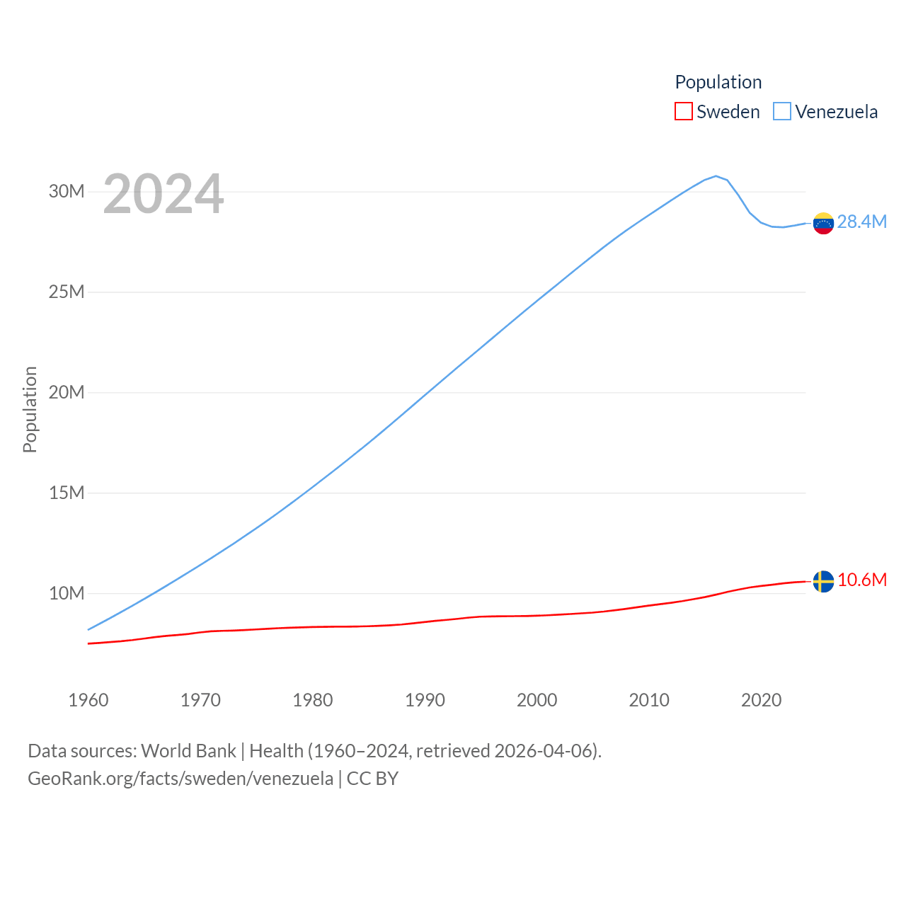 Sweden has a population of 10.6M (ranked 93/197), compared with 28.4M in Venezuela (ranked 53/197). Sweden's land area is 157,248 sq mi versus 340,561 sq mi for Venezuela (ranked 58th vs. 32nd).