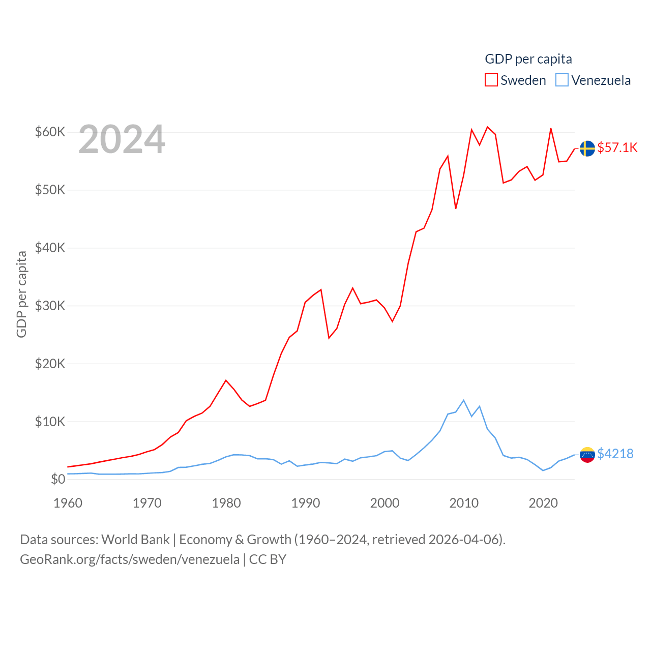 By GDP, Sweden ranks 26/197 ($604B) and Venezuela ranks 65/197 ($120B). By GDP per capita, Sweden ranks 17/197 ($57,117), while Venezuela ranks 128/197 ($4,218).
