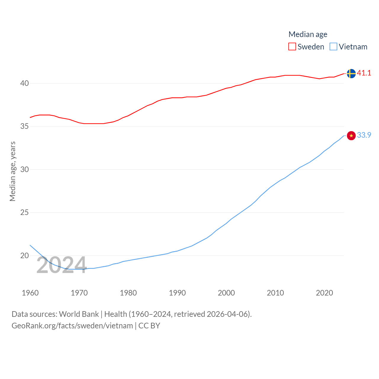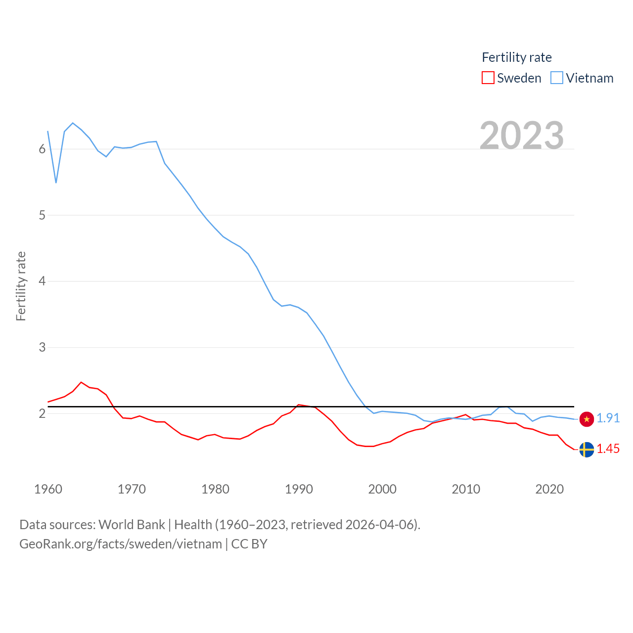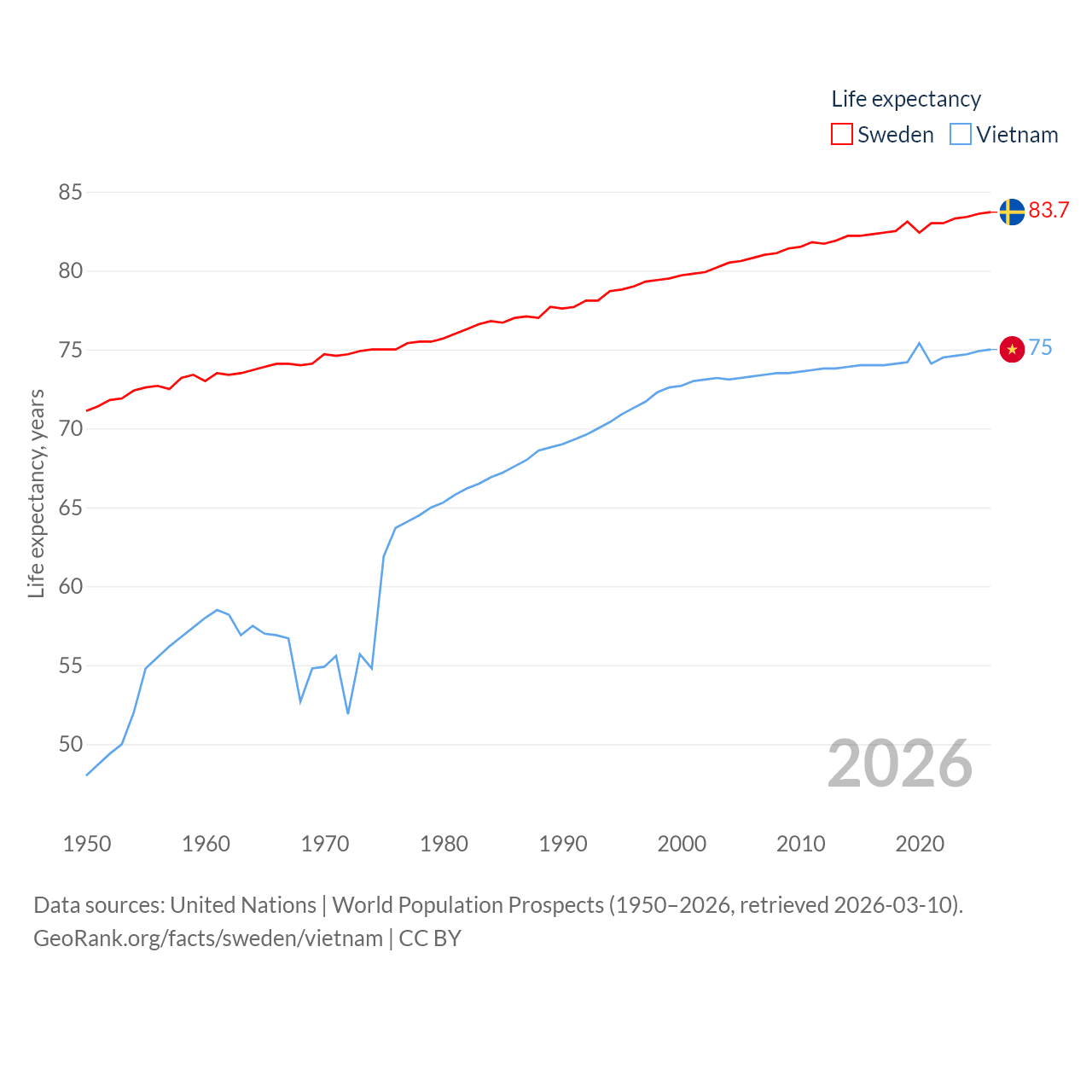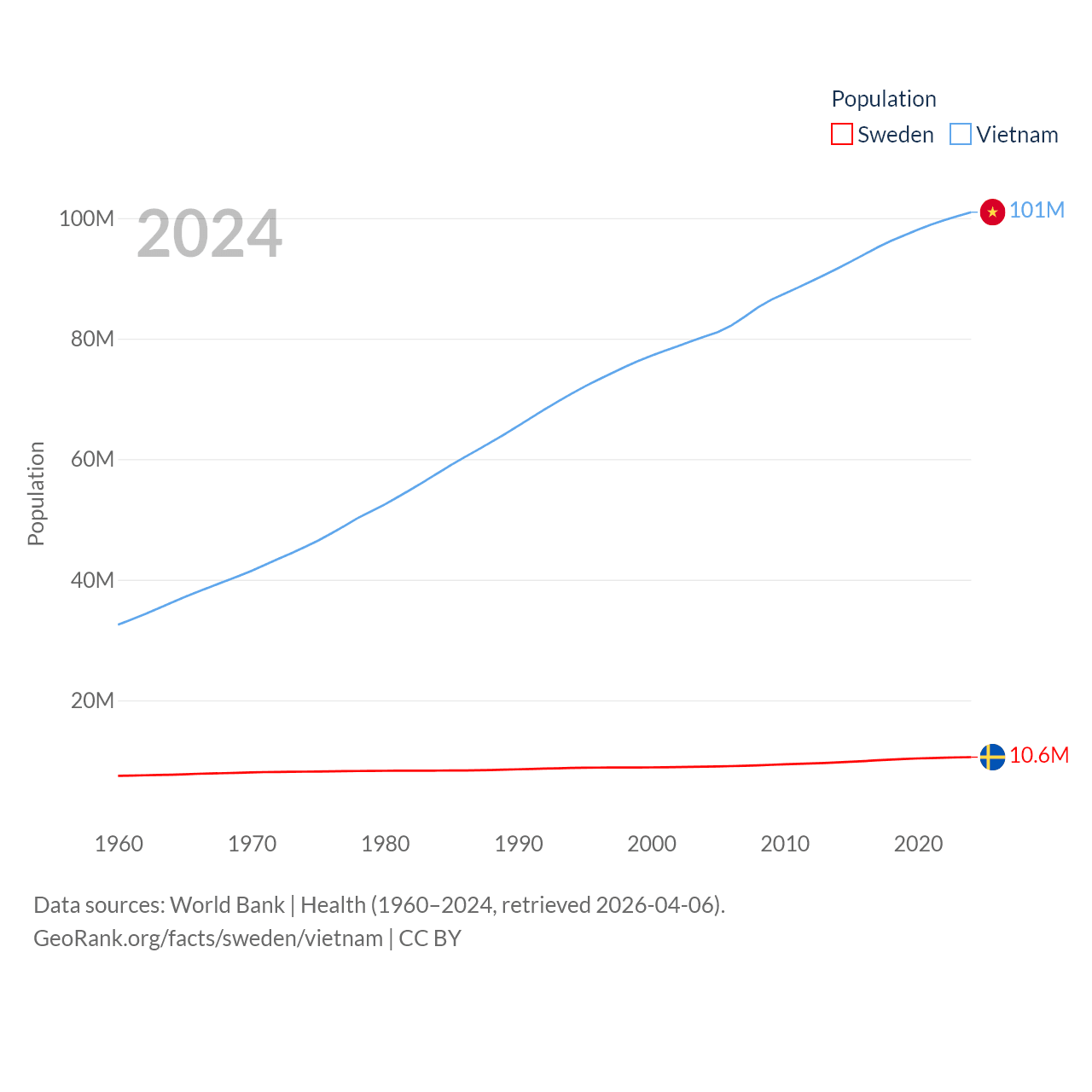 Sweden has a population of 10.6M (ranked 93/197), compared with 101M in Vietnam (ranked 16/197). Sweden's land area is 157,248 sq mi versus 121,016 sq mi for Vietnam (ranked 58th vs. 67th).
