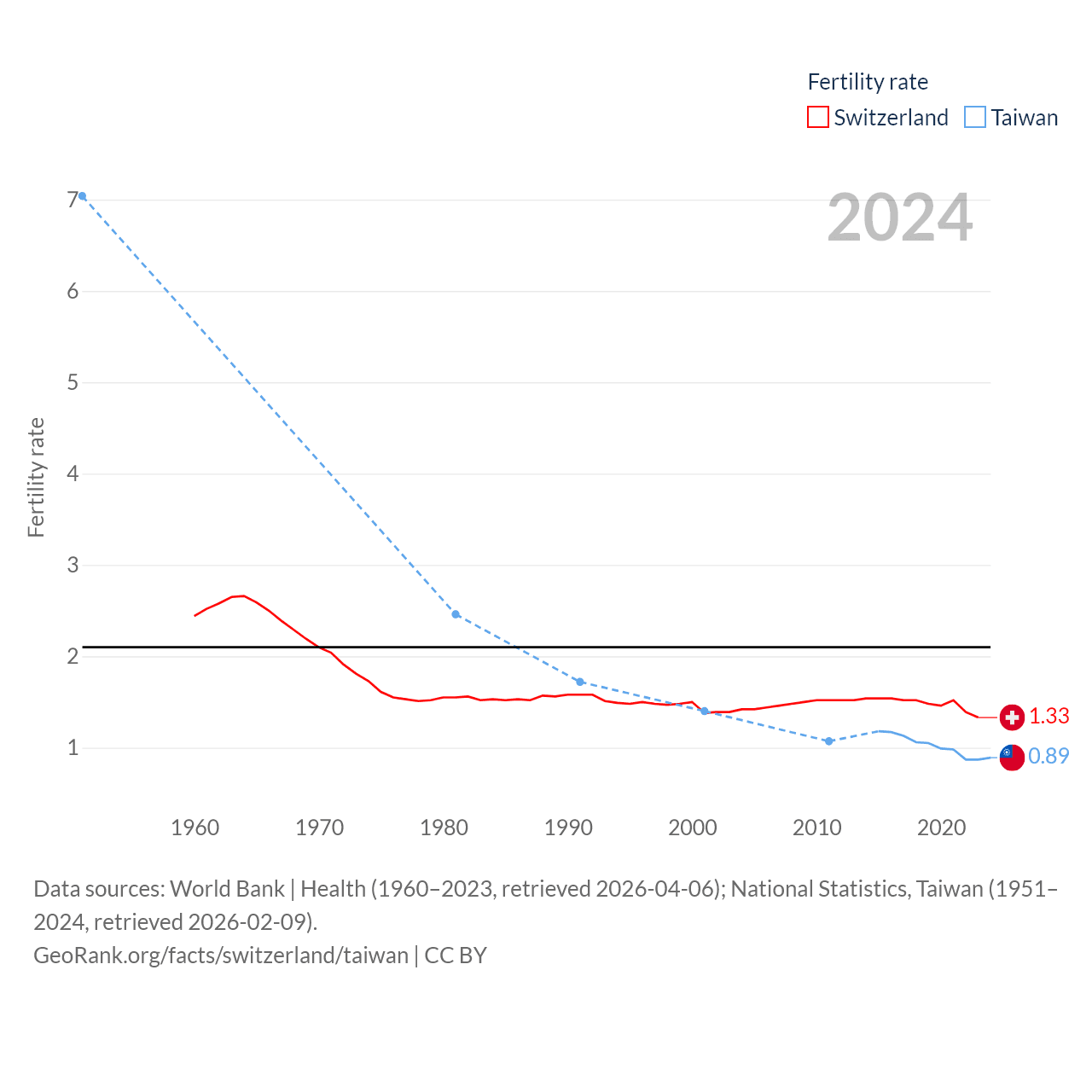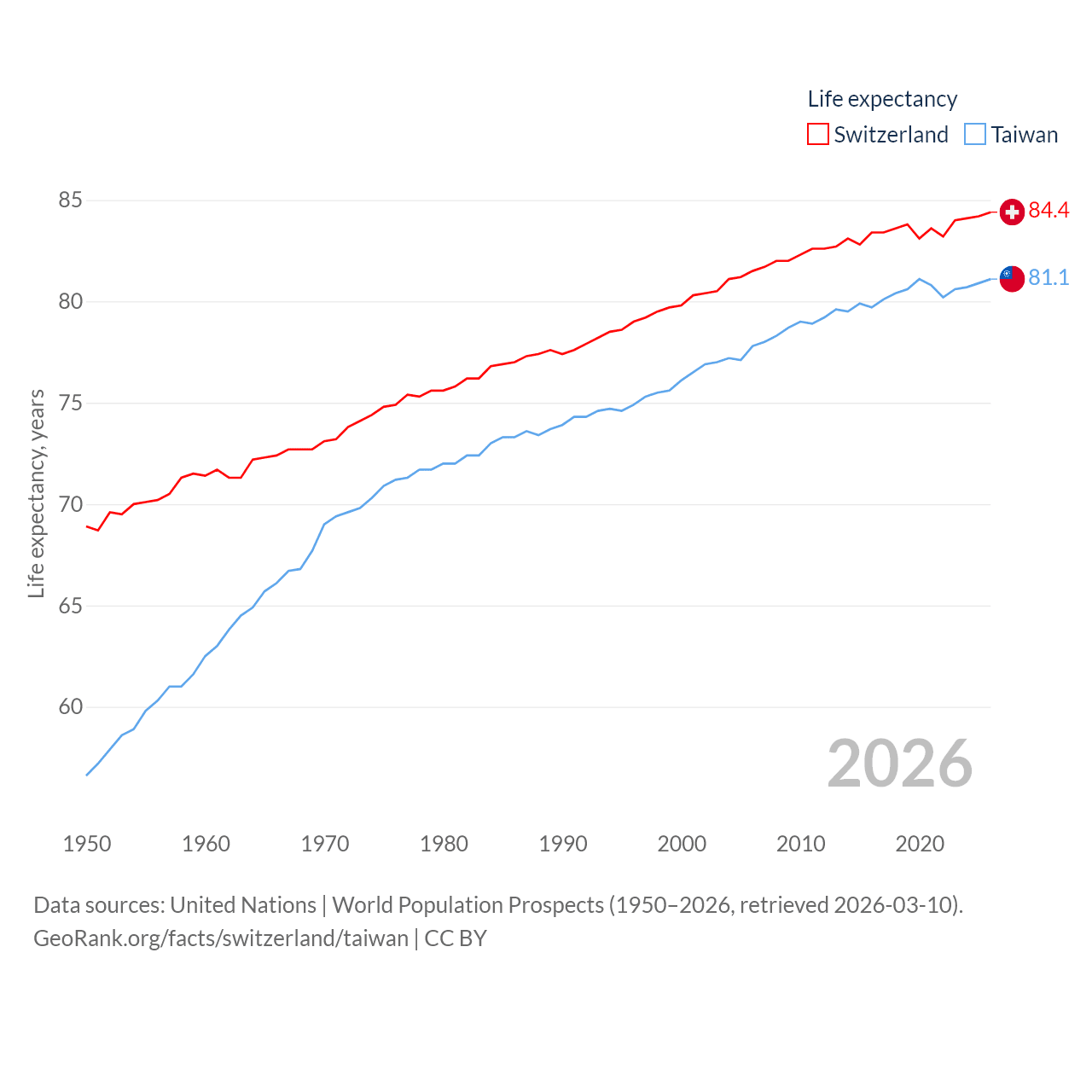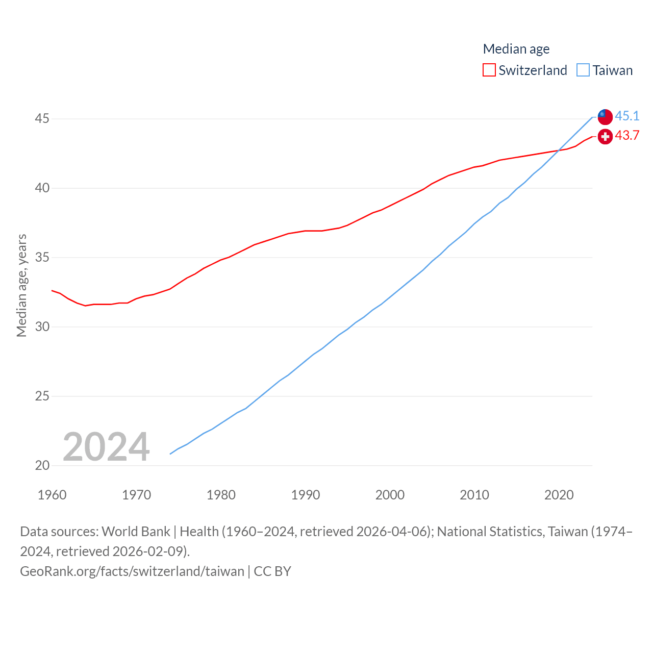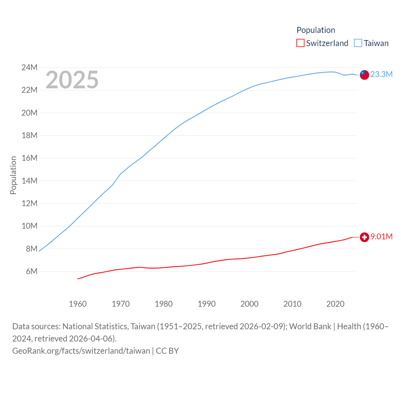 Switzerland has a population of 9.01M (ranked 101/197), compared with 23.3M in Taiwan (ranked 60/197). Switzerland's land area is 15,255 sq mi versus 13,976 sq mi for Taiwan (ranked 131st vs. 133rd).
