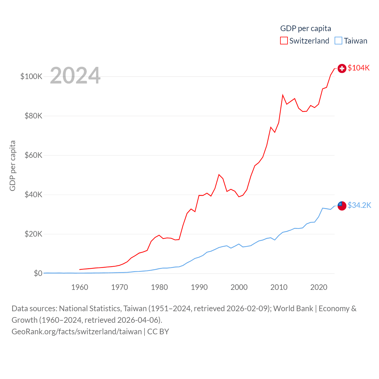 By GDP, Switzerland ranks 20/197 ($937B) and Taiwan ranks 22/197 ($802B). By GDP per capita, Switzerland ranks 5/197 ($103,998), while Taiwan ranks 35/197 ($34,238).