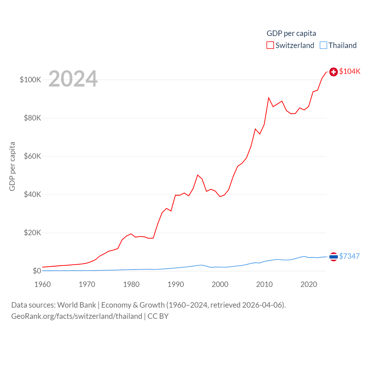 By GDP, Switzerland ranks 20/197 ($937B) and Thailand ranks 31/197 ($527B). By GDP per capita, Switzerland ranks 5/197 ($103,998), while Thailand ranks 100/197 ($7,347).