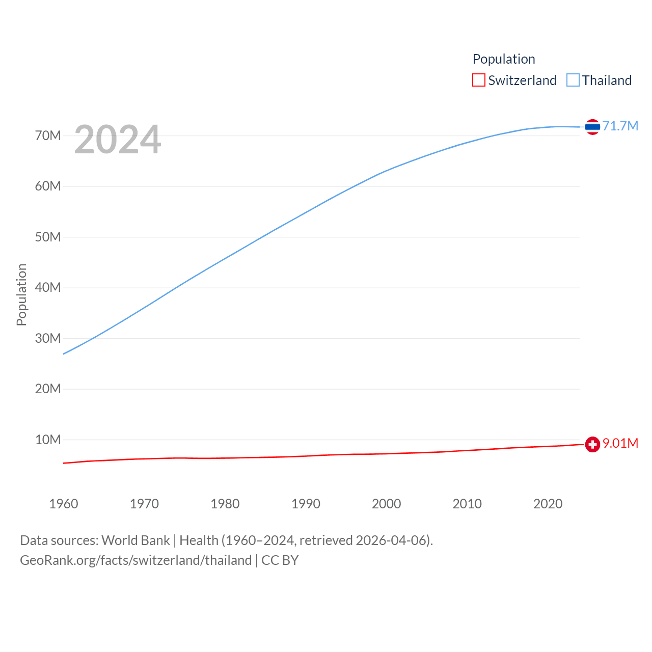 Switzerland has a population of 9.01M (ranked 101/197), compared with 71.7M in Thailand (ranked 20/197). Switzerland's land area is 15,255 sq mi versus 197,256 sq mi for Thailand (ranked 131st vs. 50th).