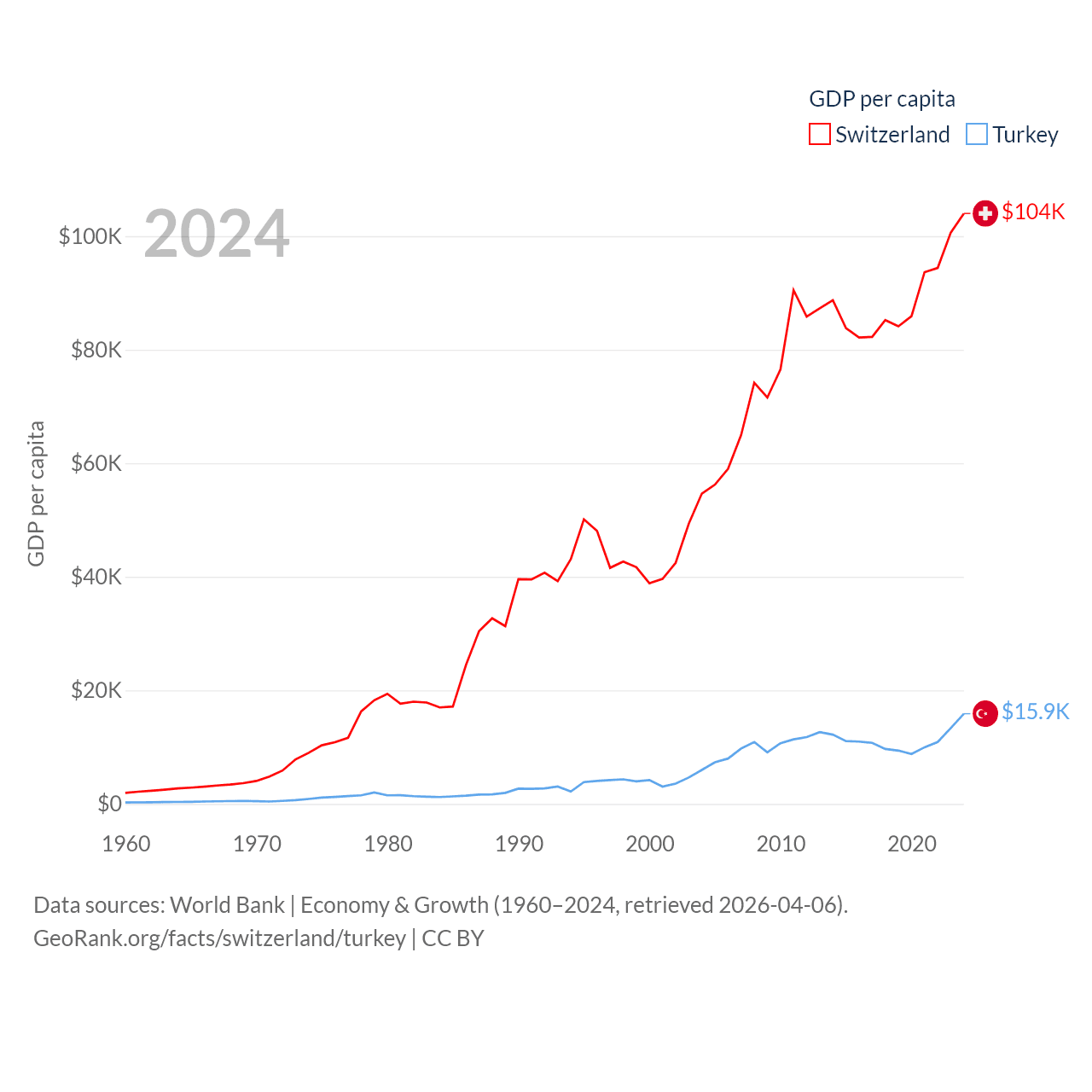 By GDP, Switzerland ranks 20/197 ($937B) and Turkey ranks 17/197 ($1.36T). By GDP per capita, Switzerland ranks 5/197 ($103,998), while Turkey ranks 66/197 ($15,893).