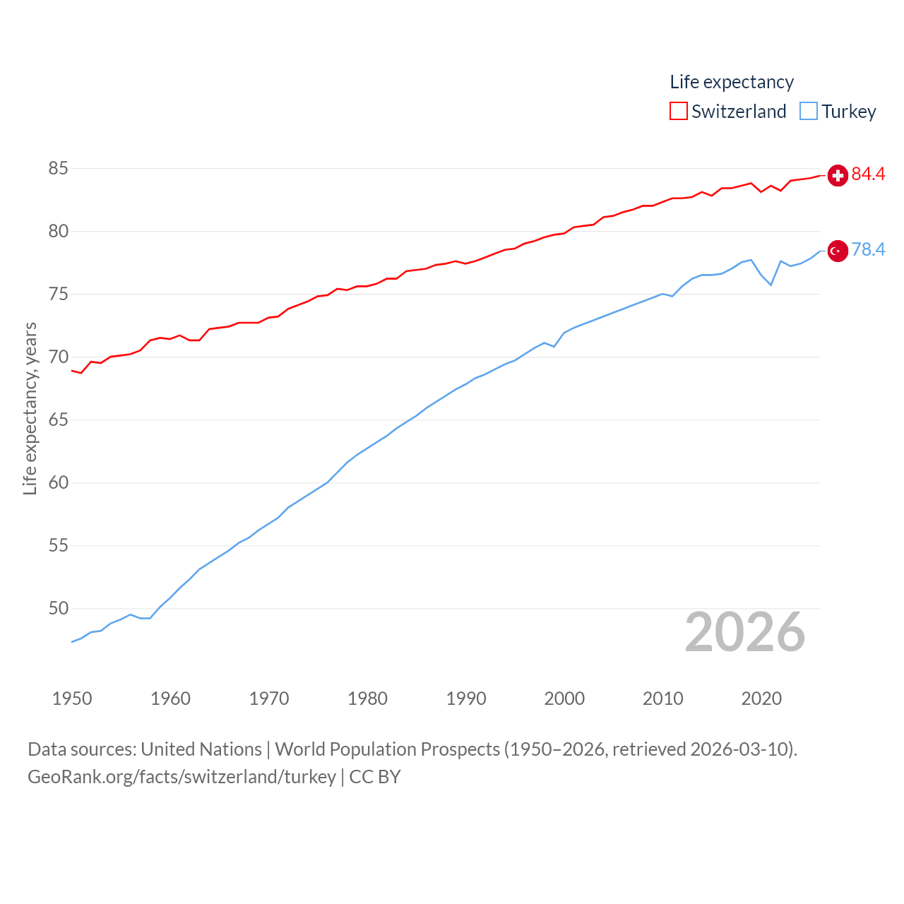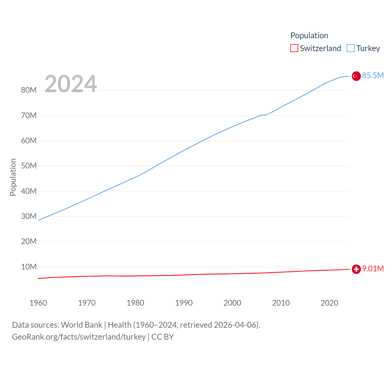 Switzerland has a population of 9.01M (ranked 101/197), compared with 85.5M in Turkey (ranked 18/197). Switzerland's land area is 15,255 sq mi versus 297,156 sq mi for Turkey (ranked 131st vs. 36th).