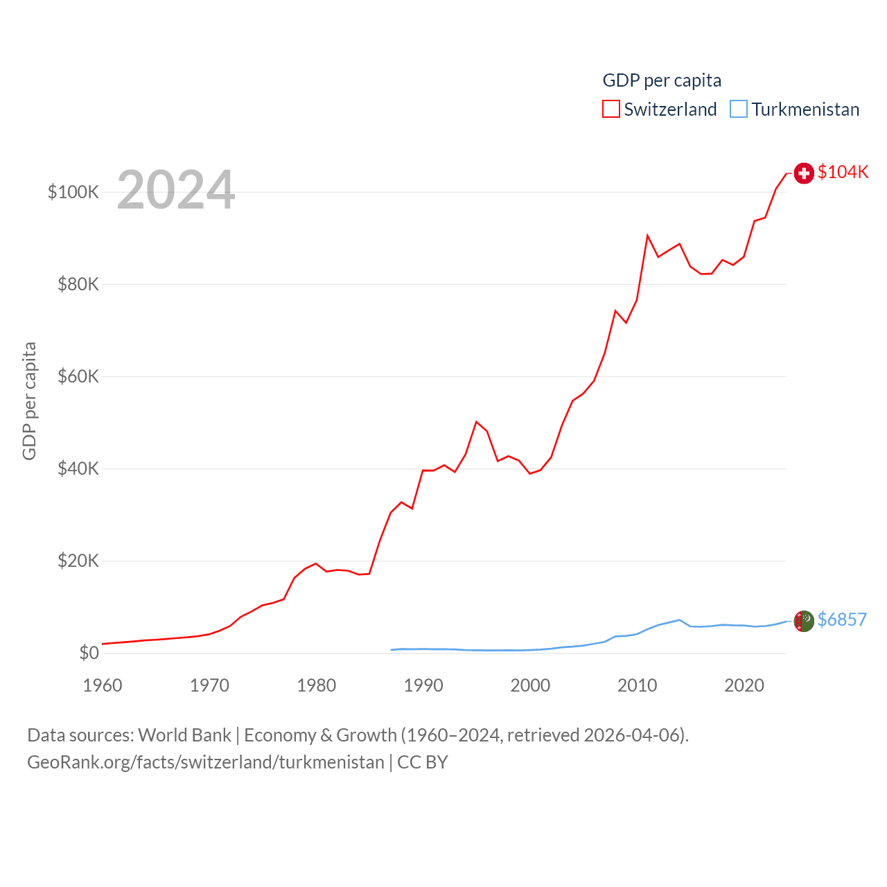 By GDP, Switzerland ranks 20/197 ($937B) and Turkmenistan ranks 92/197 ($51.4B). By GDP per capita, Switzerland ranks 5/197 ($103,998), while Turkmenistan ranks 104/197 ($6,857).