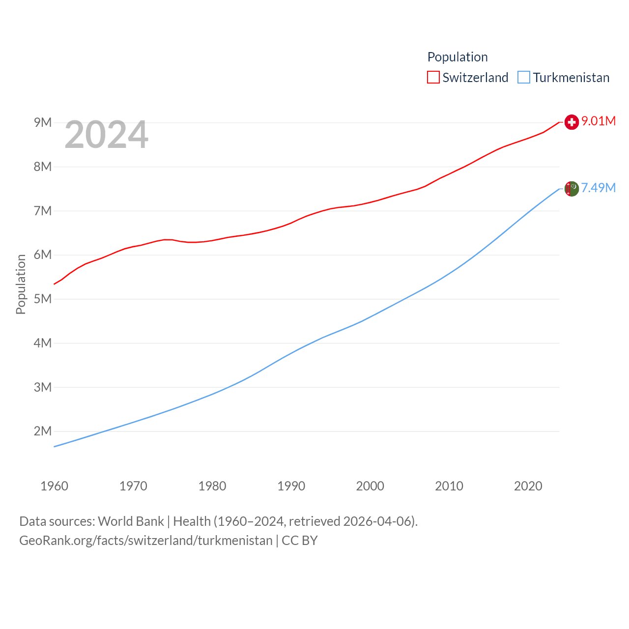 Switzerland has a population of 9.01M (ranked 101/197), compared with 7.49M in Turkmenistan (ranked 104/197). Switzerland's land area is 15,255 sq mi versus 181,441 sq mi for Turkmenistan (ranked 131st vs. 53rd).
