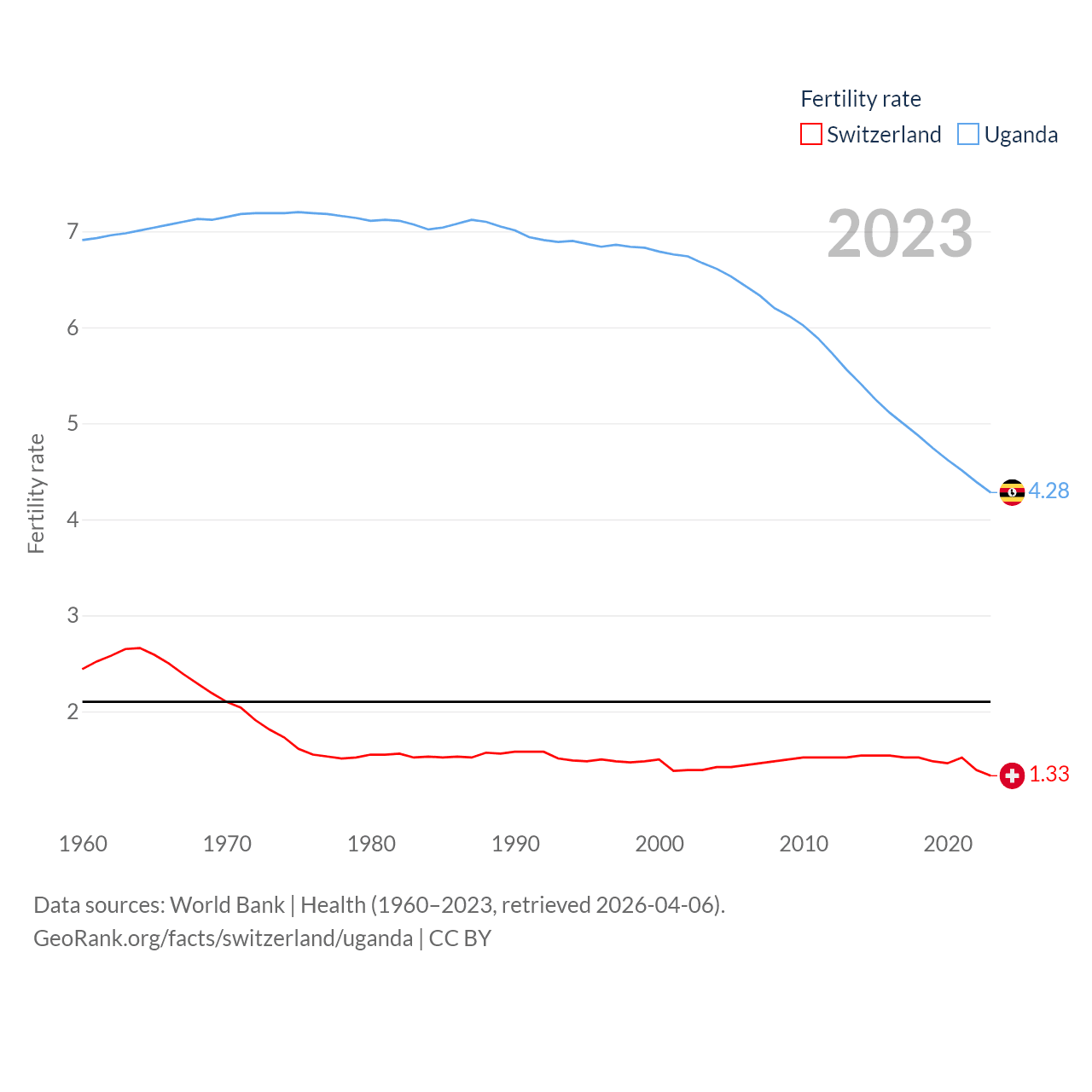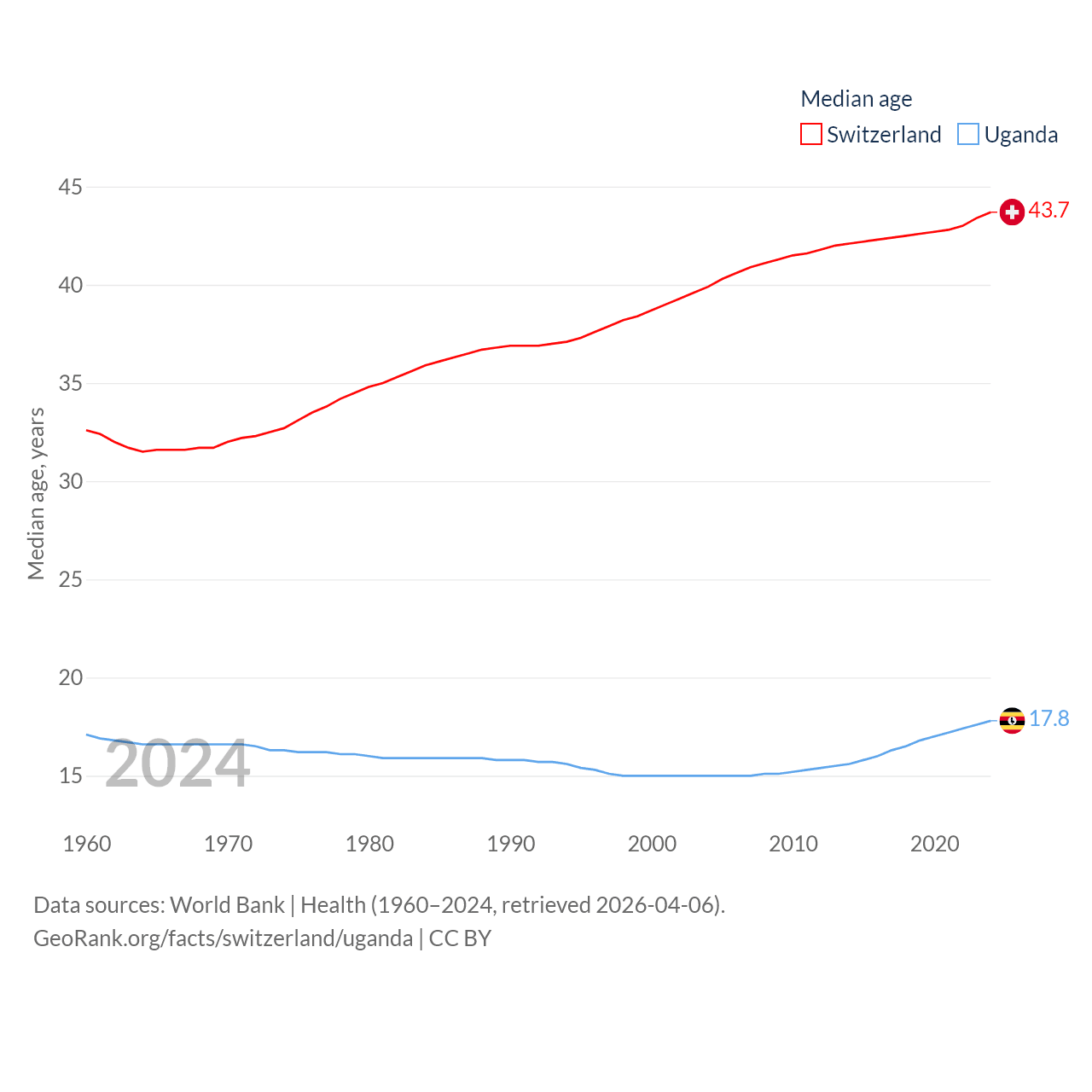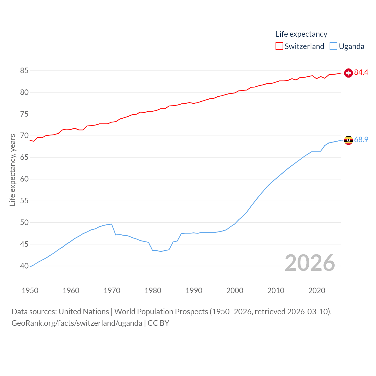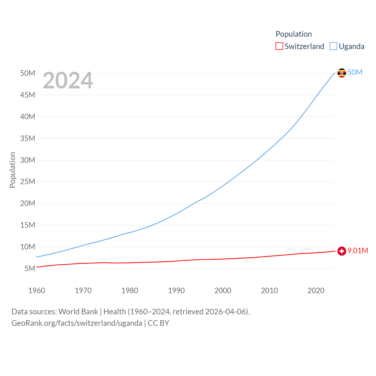 Switzerland has a population of 9.01M (ranked 101/197), compared with 50M in Uganda (ranked 31/197). Switzerland's land area is 15,255 sq mi versus 77,421 sq mi for Uganda (ranked 131st vs. 84th).