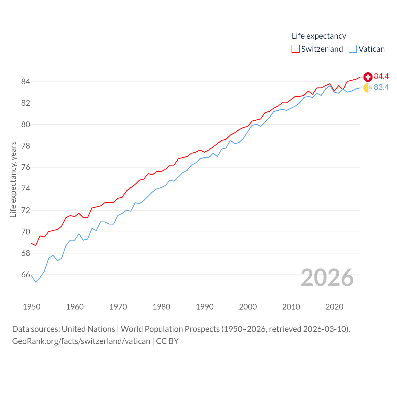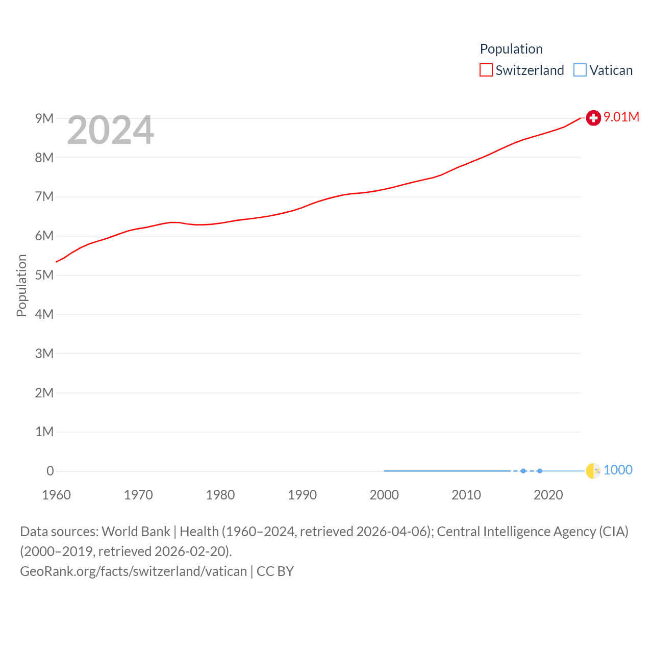 Switzerland has a population of 9.01M (ranked 101/197), compared with 1K in The Vatican (ranked 197/197). Switzerland's land area is 15,255 sq mi versus 0.17 sq mi for The Vatican (ranked 131st vs. 197th).