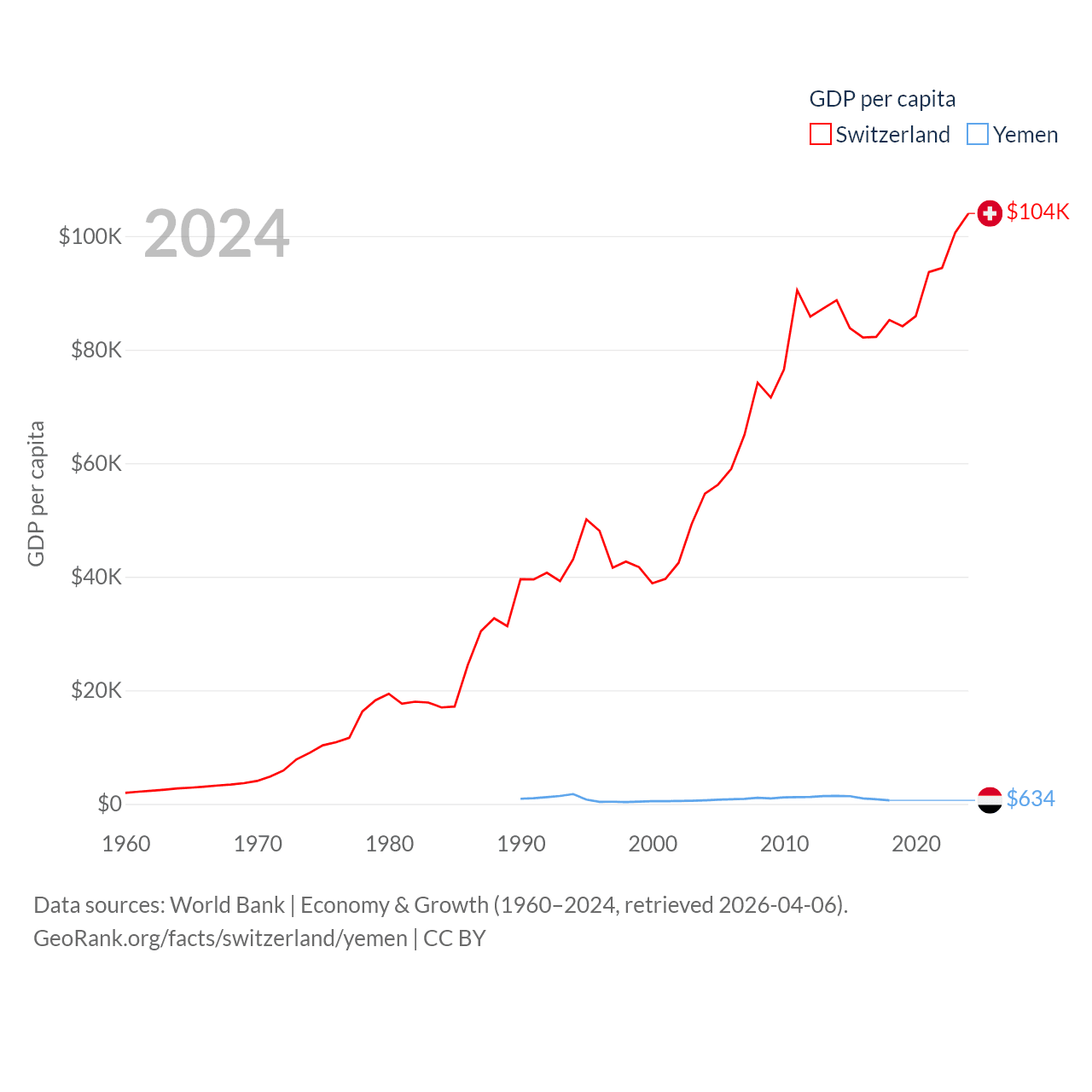 By GDP, Switzerland ranks 20/197 ($937B) and Yemen ranks 125/197 ($21.6B). By GDP per capita, Switzerland ranks 5/197 ($103,998), while Yemen ranks 191/197 ($634).