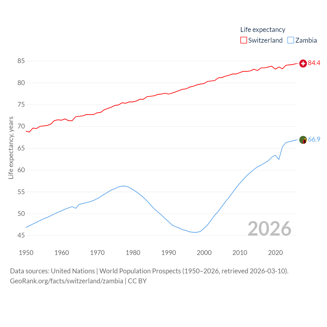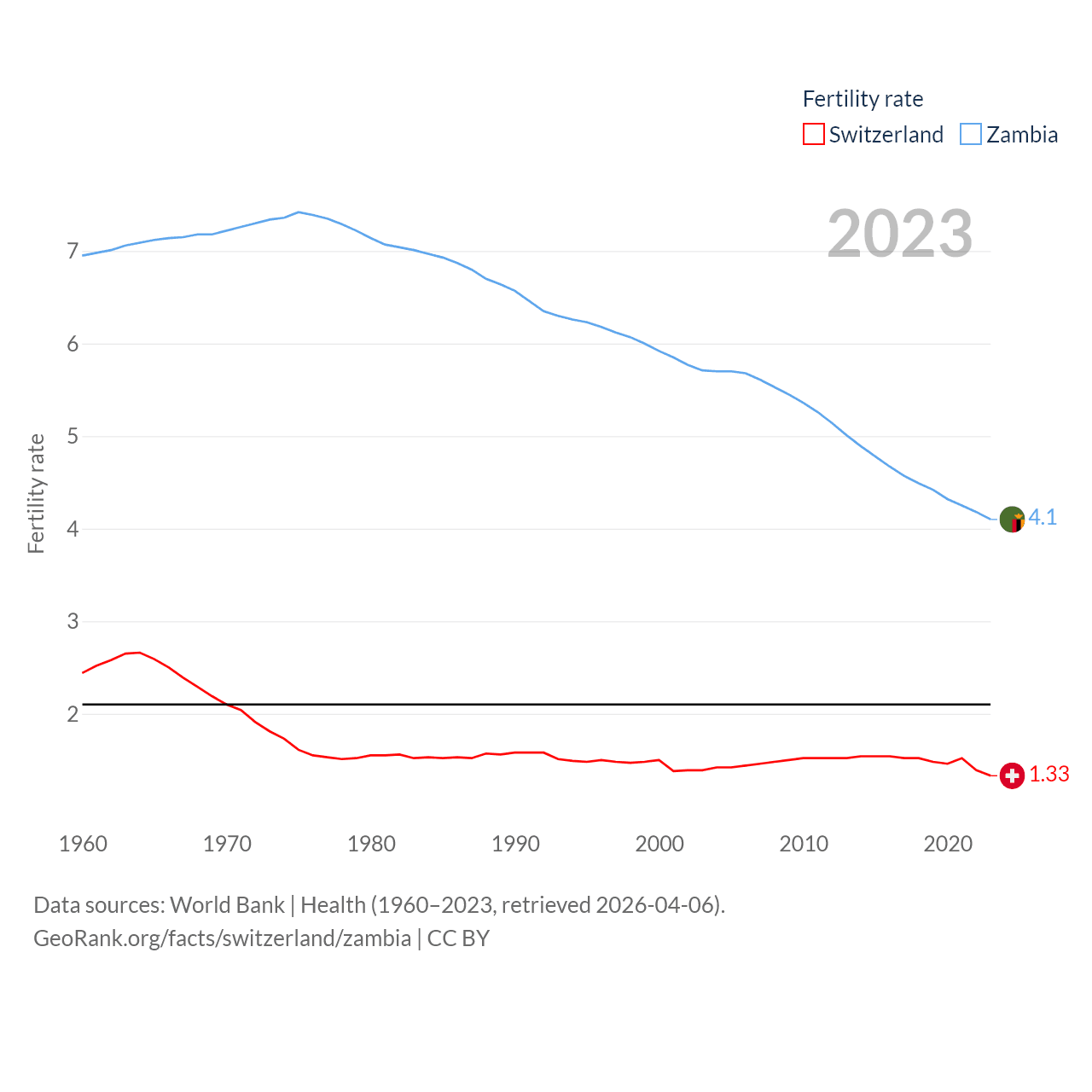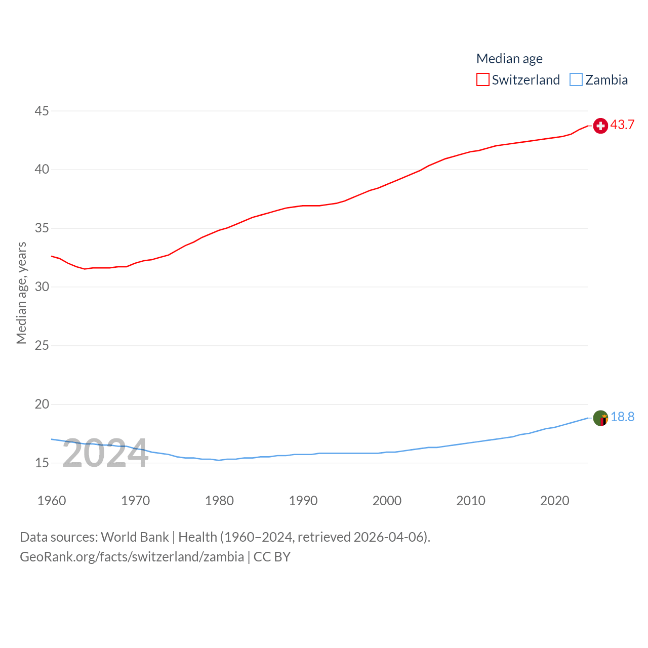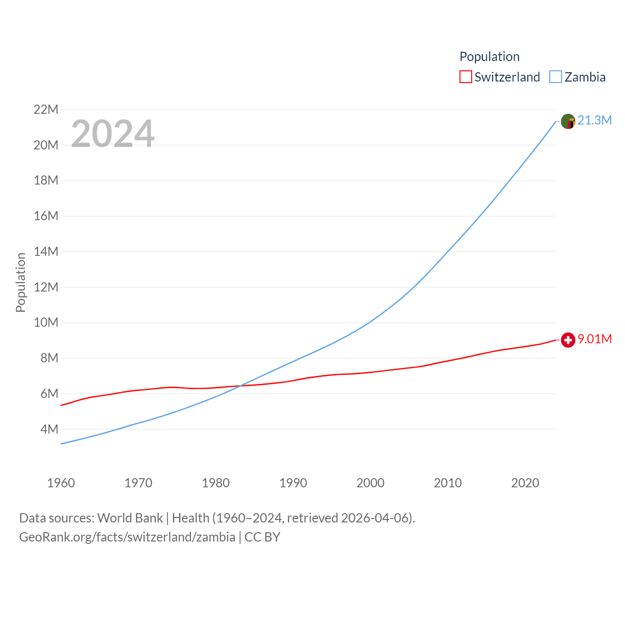 Switzerland has a population of 9.01M (ranked 101/197), compared with 21.3M in Zambia (ranked 63/197). Switzerland's land area is 15,255 sq mi versus 287,024 sq mi for Zambia (ranked 131st vs. 37th).