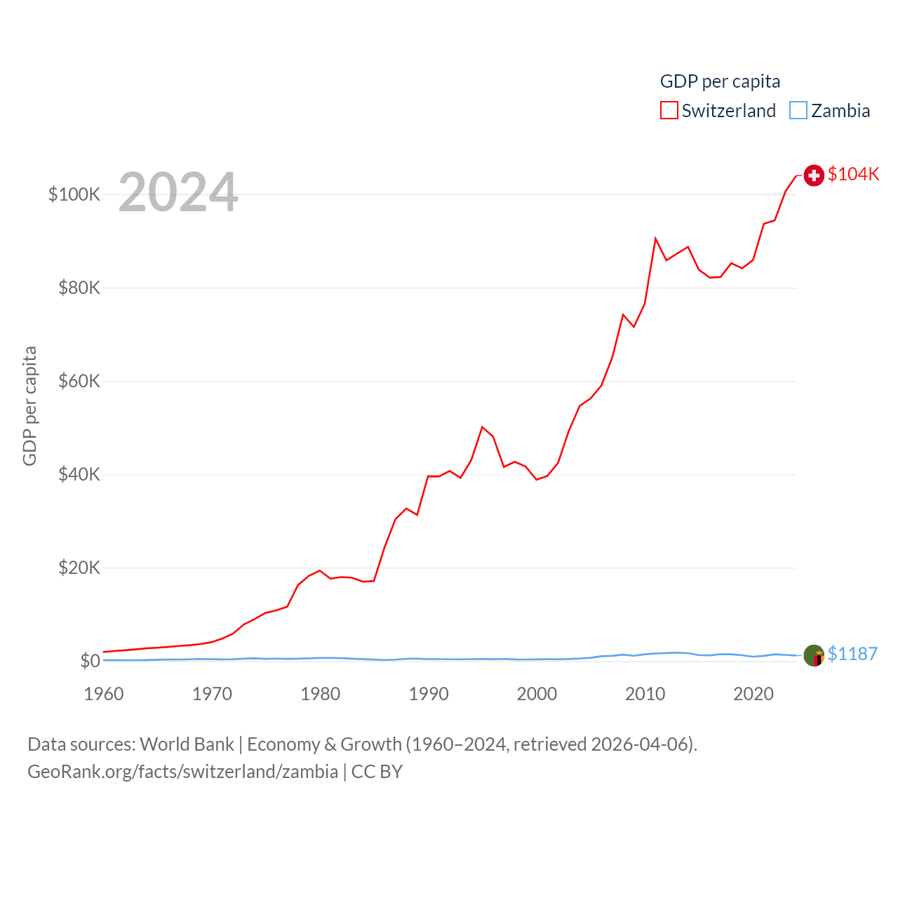 By GDP, Switzerland ranks 20/197 ($937B) and Zambia ranks 116/197 ($25.3B). By GDP per capita, Switzerland ranks 5/197 ($103,998), while Zambia ranks 169/197 ($1,187).