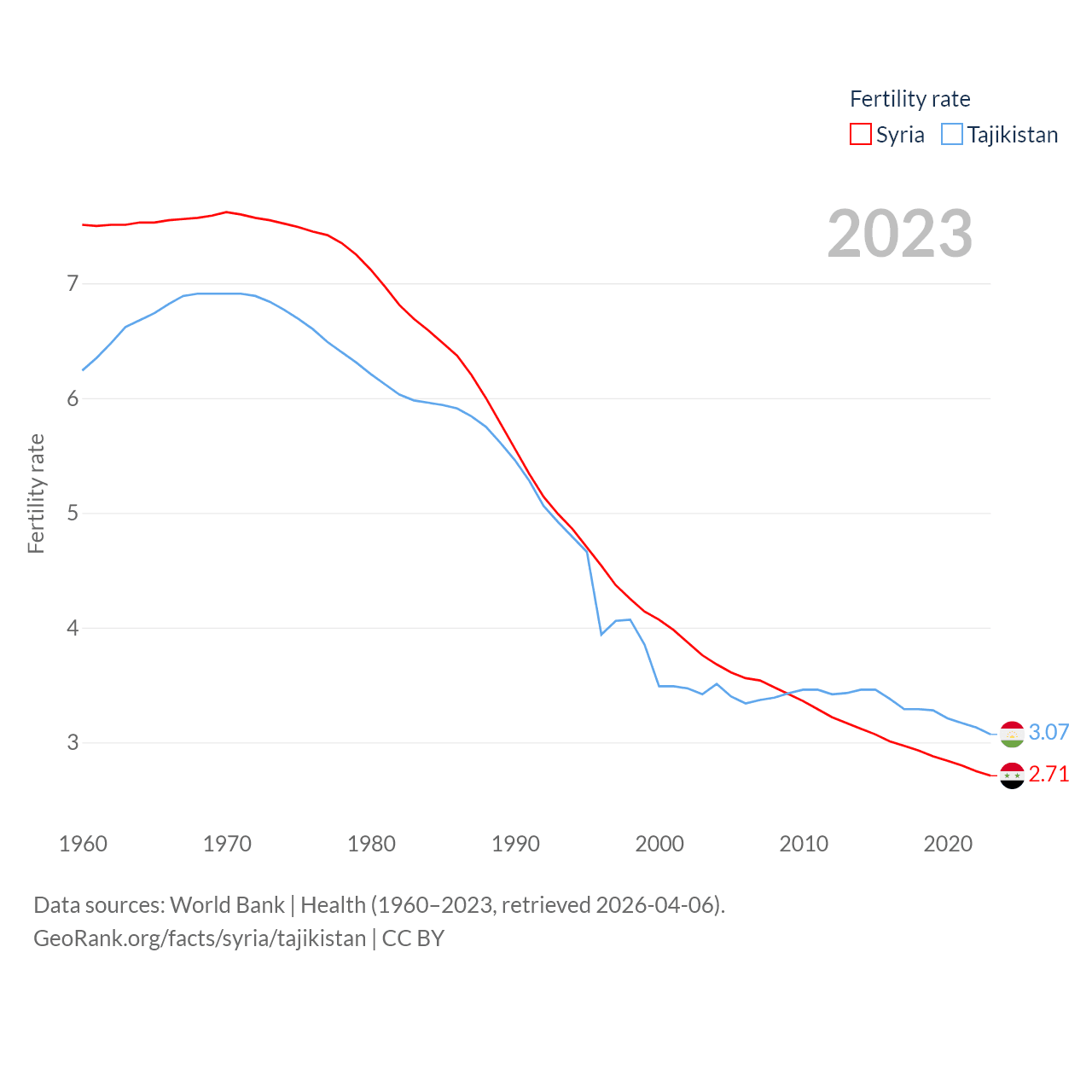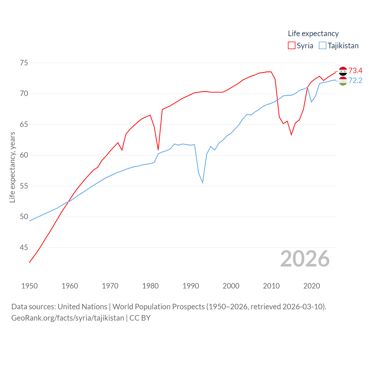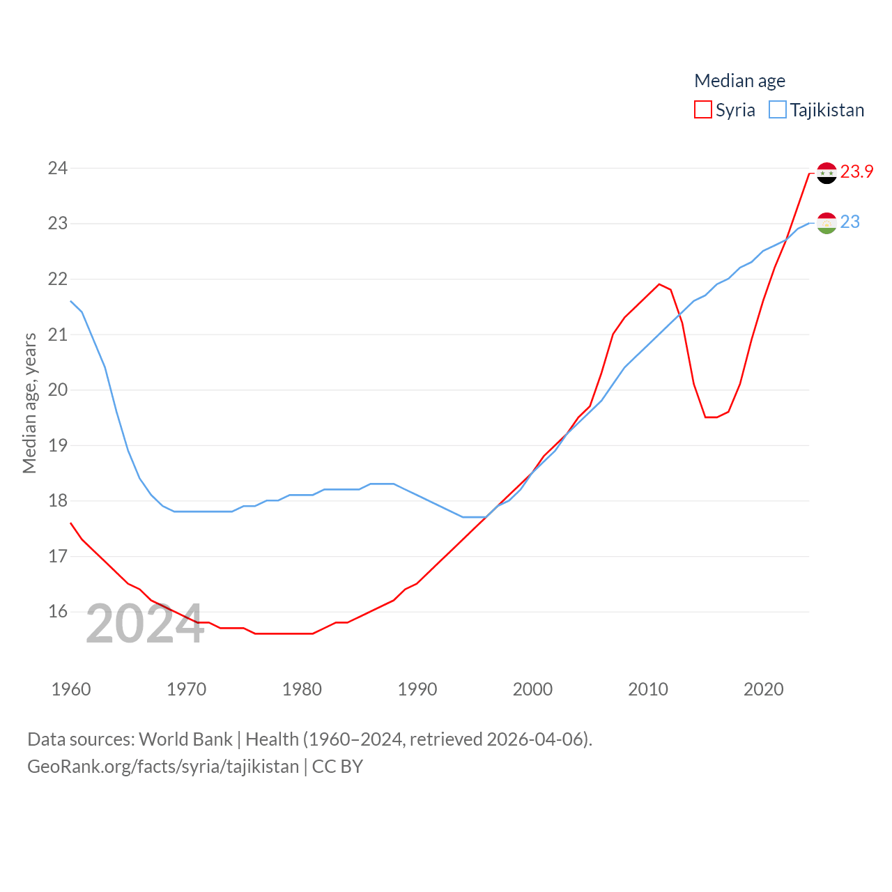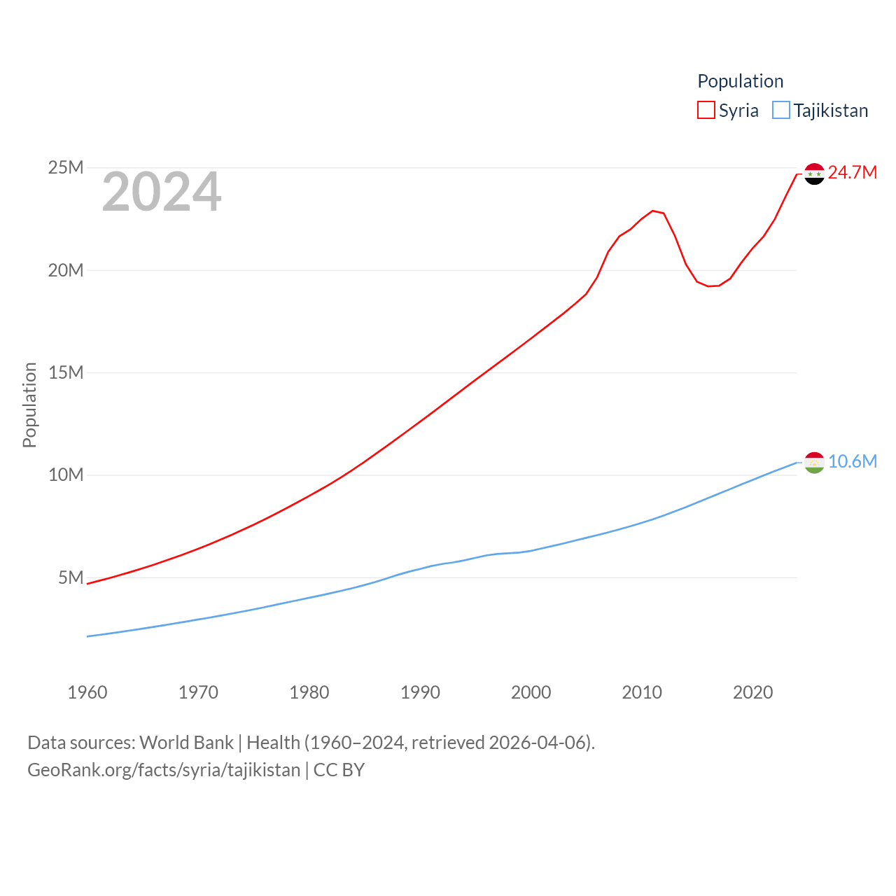 Syria has a population of 24.7M (ranked 57/197), compared with 10.6M in Tajikistan (ranked 91/197). Syria's land area is 70,900 sq mi versus 53,587 sq mi for Tajikistan (ranked 87th vs. 93rd).