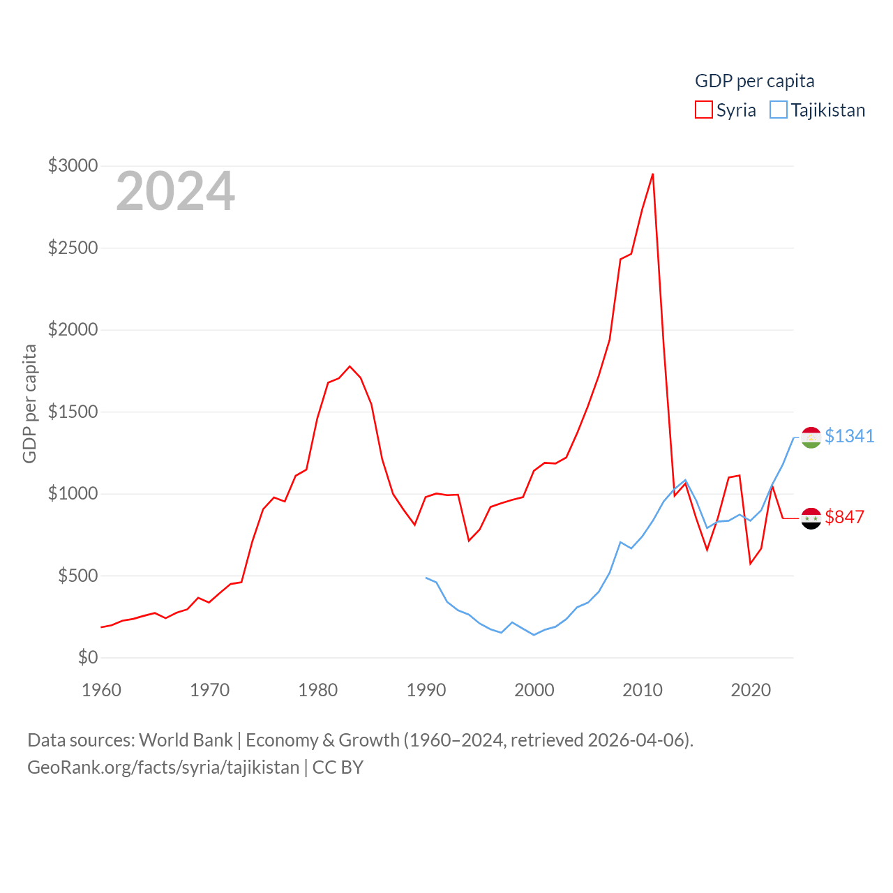 By GDP, Syria ranks 129/197 ($20B) and Tajikistan ranks 145/197 ($14.2B). By GDP per capita, Syria ranks 185/197 ($847), while Tajikistan ranks 166/197 ($1,341).