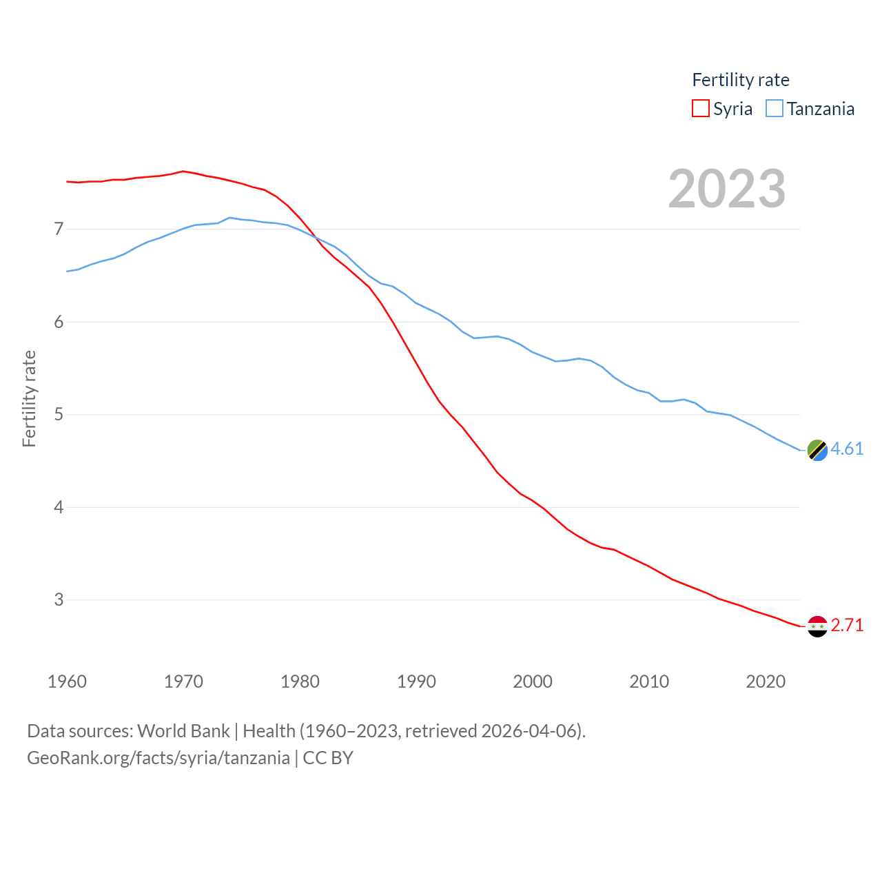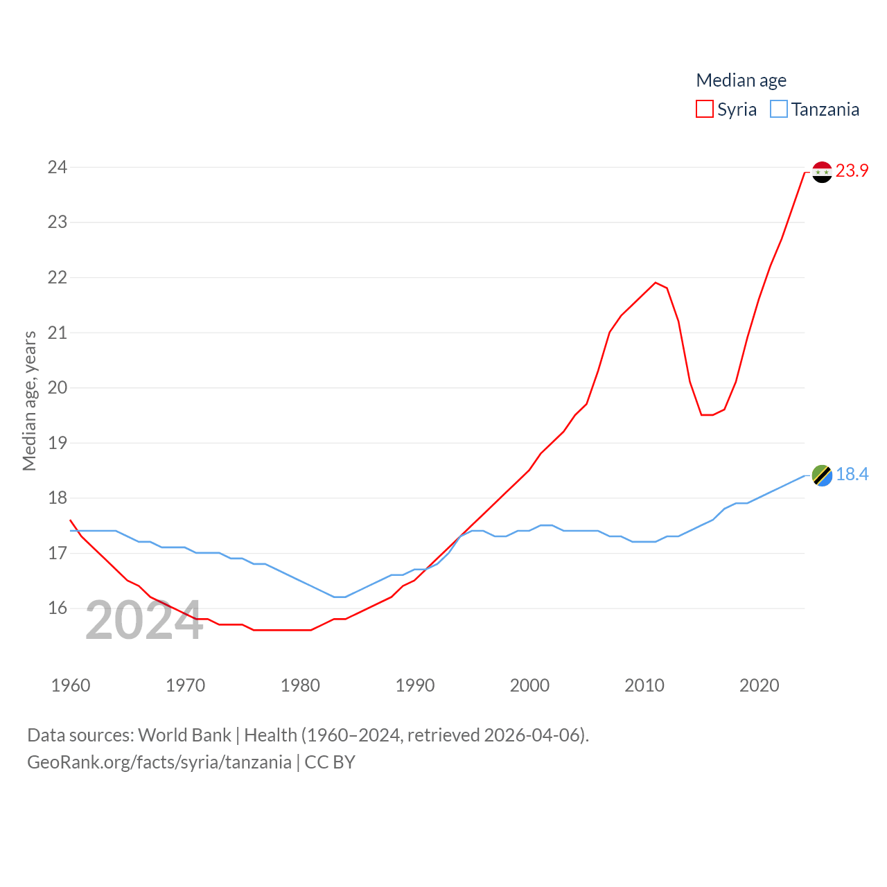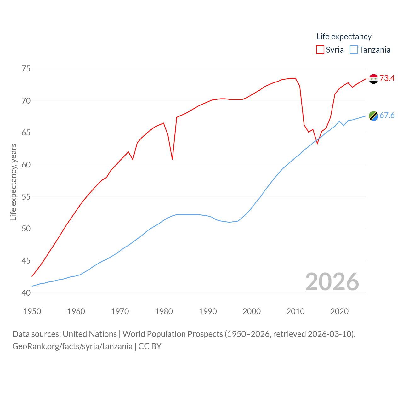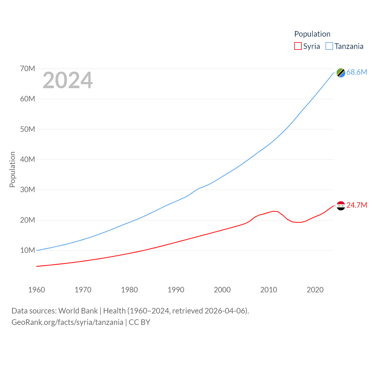 Syria has a population of 24.7M (ranked 57/197), compared with 68.6M in Tanzania (ranked 22/197). Syria's land area is 70,900 sq mi versus 342,009 sq mi for Tanzania (ranked 87th vs. 31st).