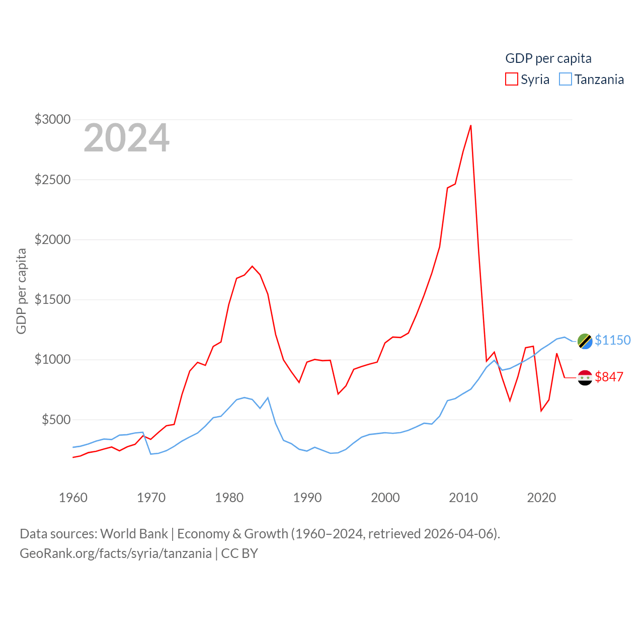 By GDP, Syria ranks 129/197 ($20B) and Tanzania ranks 82/197 ($78.8B). By GDP per capita, Syria ranks 185/197 ($847), while Tanzania ranks 170/197 ($1,150).