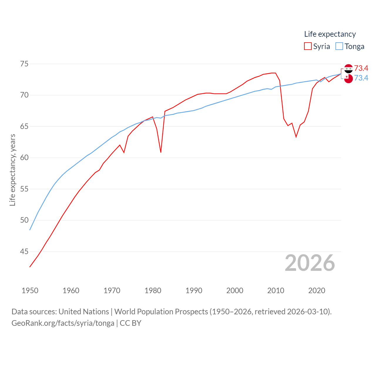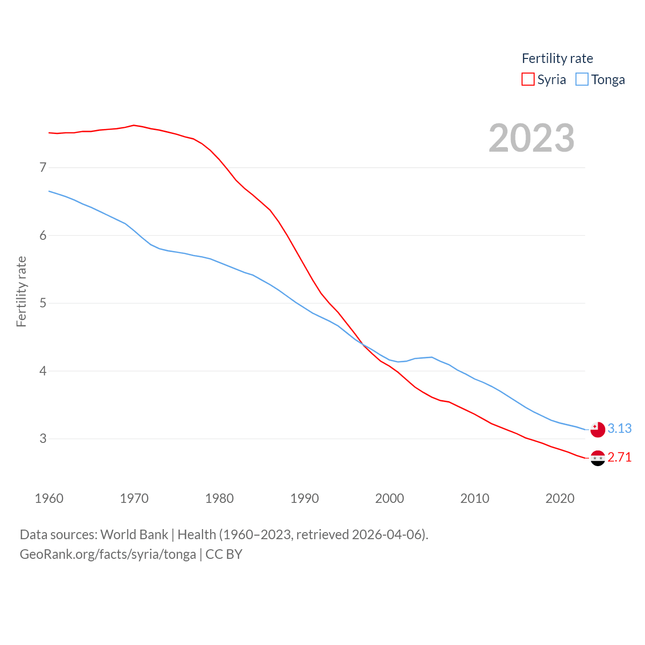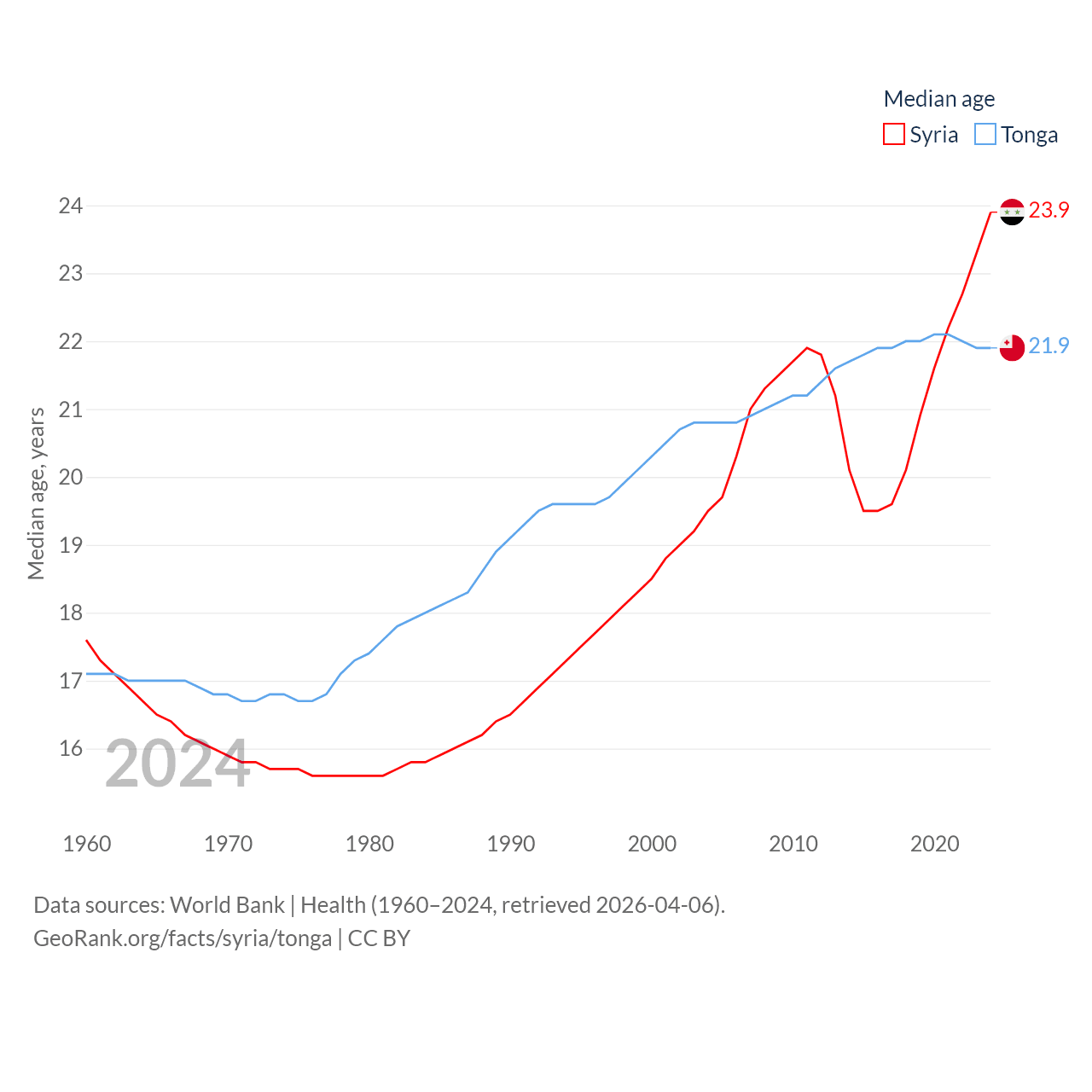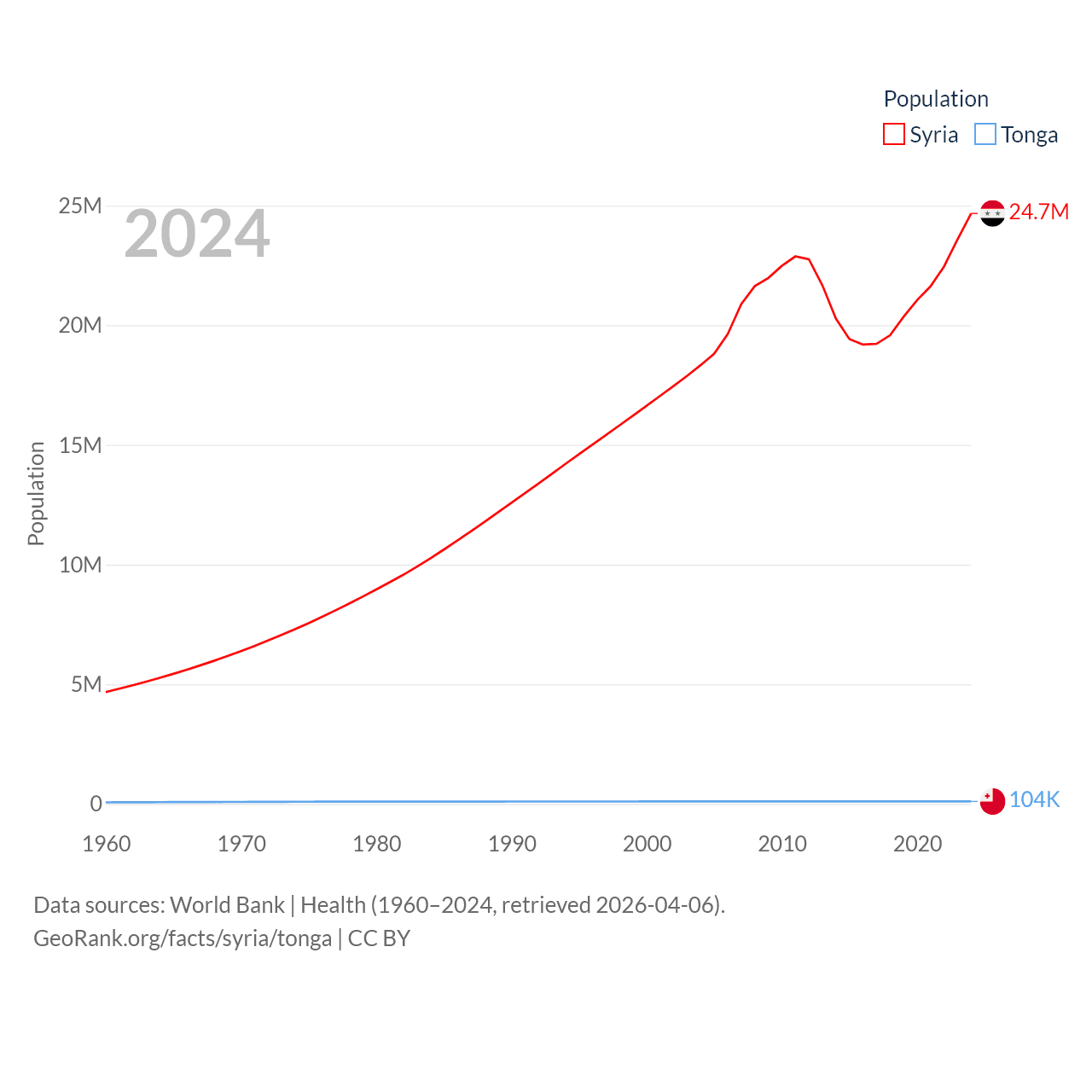 Syria has a population of 24.7M (ranked 57/197), compared with 104K in Tonga (ranked 183/197). Syria's land area is 70,900 sq mi versus 278 sq mi for Tonga (ranked 87th vs. 176th).