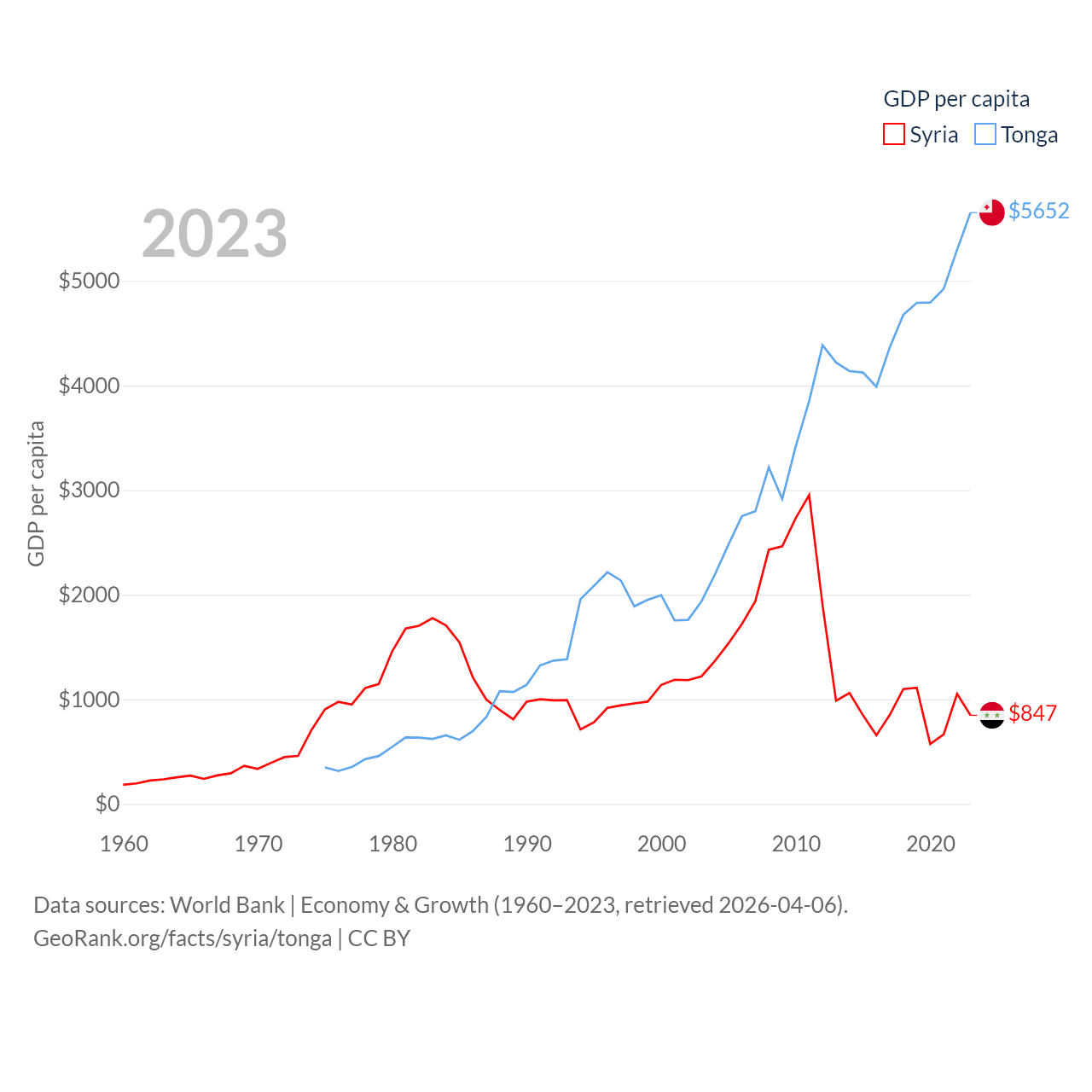 By GDP, Syria ranks 129/197 ($20B) and Tonga ranks 191/197 ($591M). By GDP per capita, Syria ranks 185/197 ($847), while Tonga ranks 115/197 ($5,652).