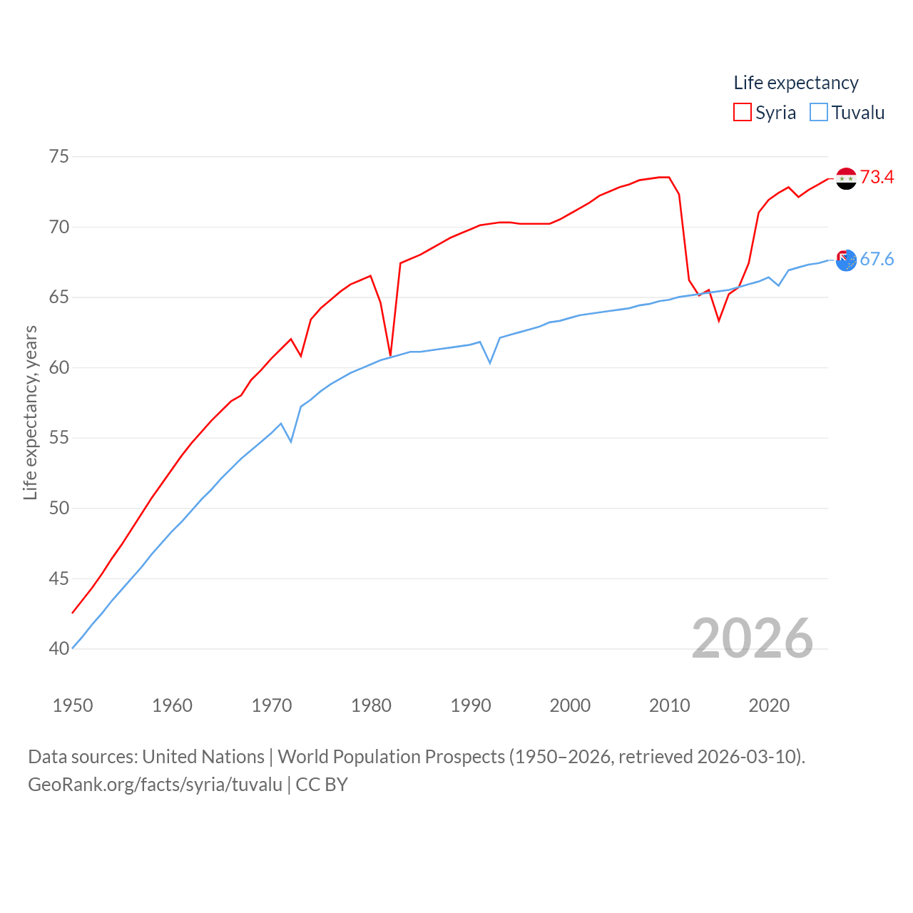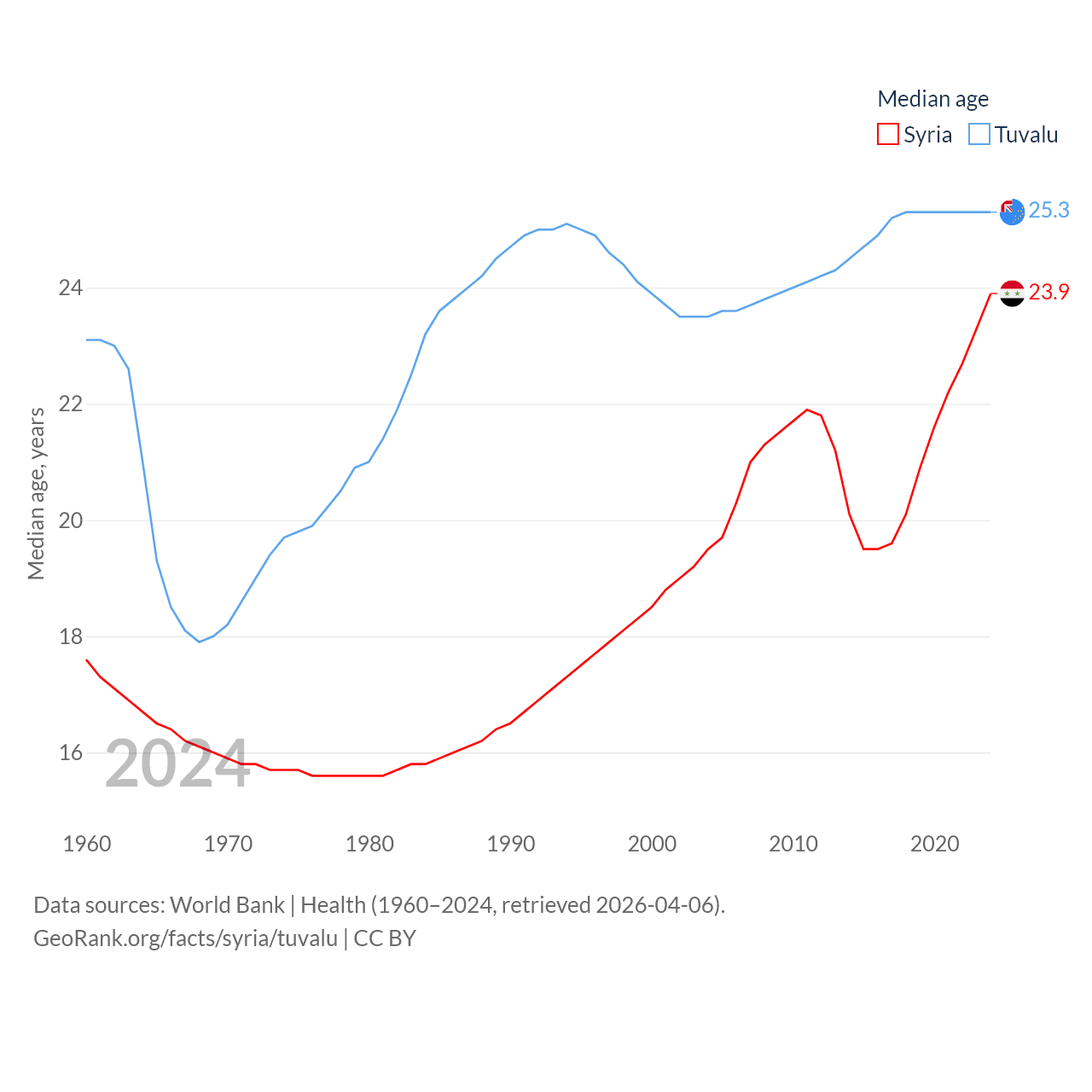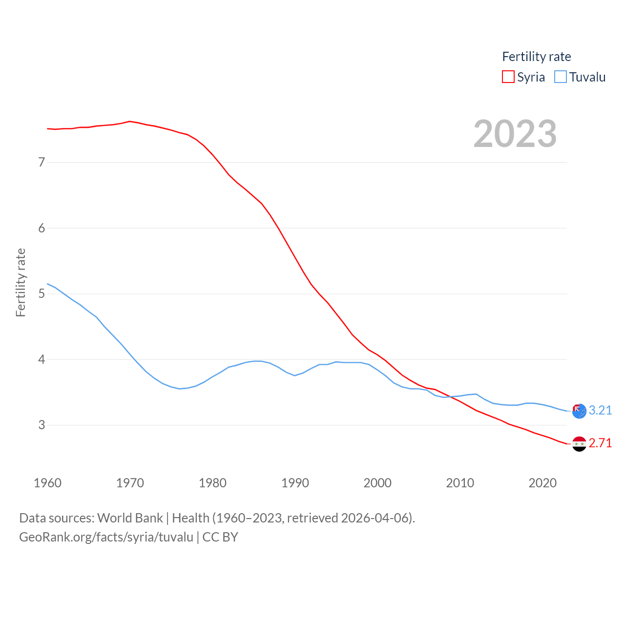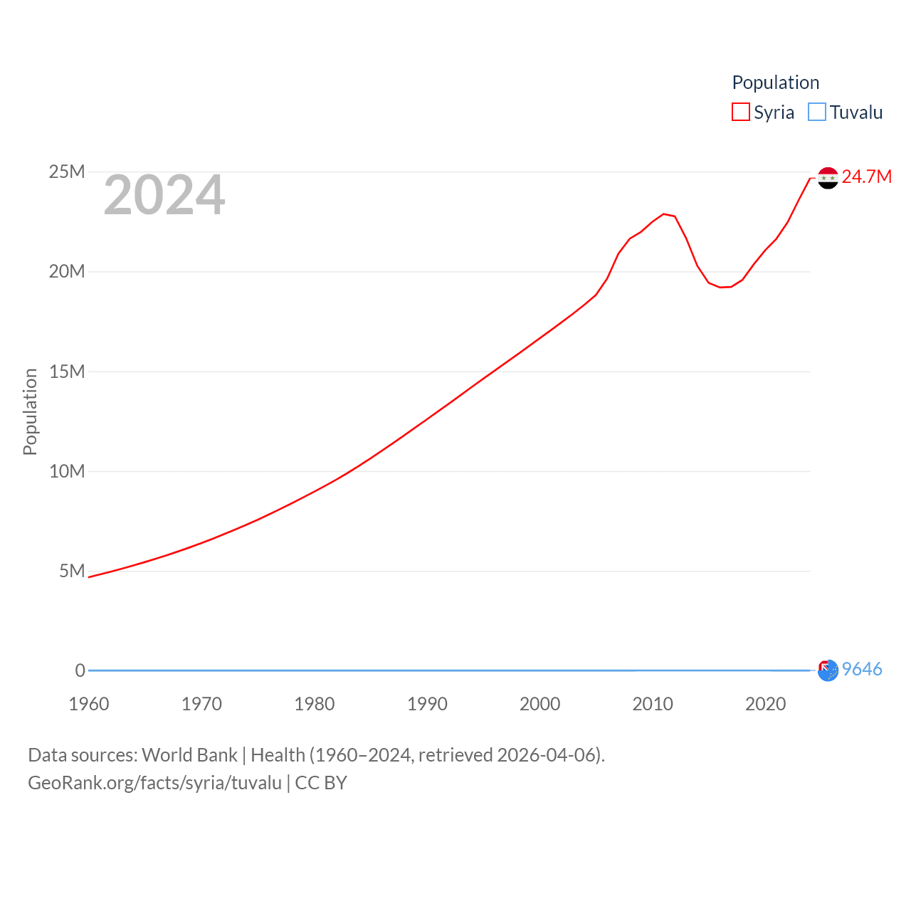 Syria has a population of 24.7M (ranked 57/197), compared with 9.65K in Tuvalu (ranked 196/197). Syria's land area is 70,900 sq mi versus 11.6 sq mi for Tuvalu (ranked 87th vs. 194th).