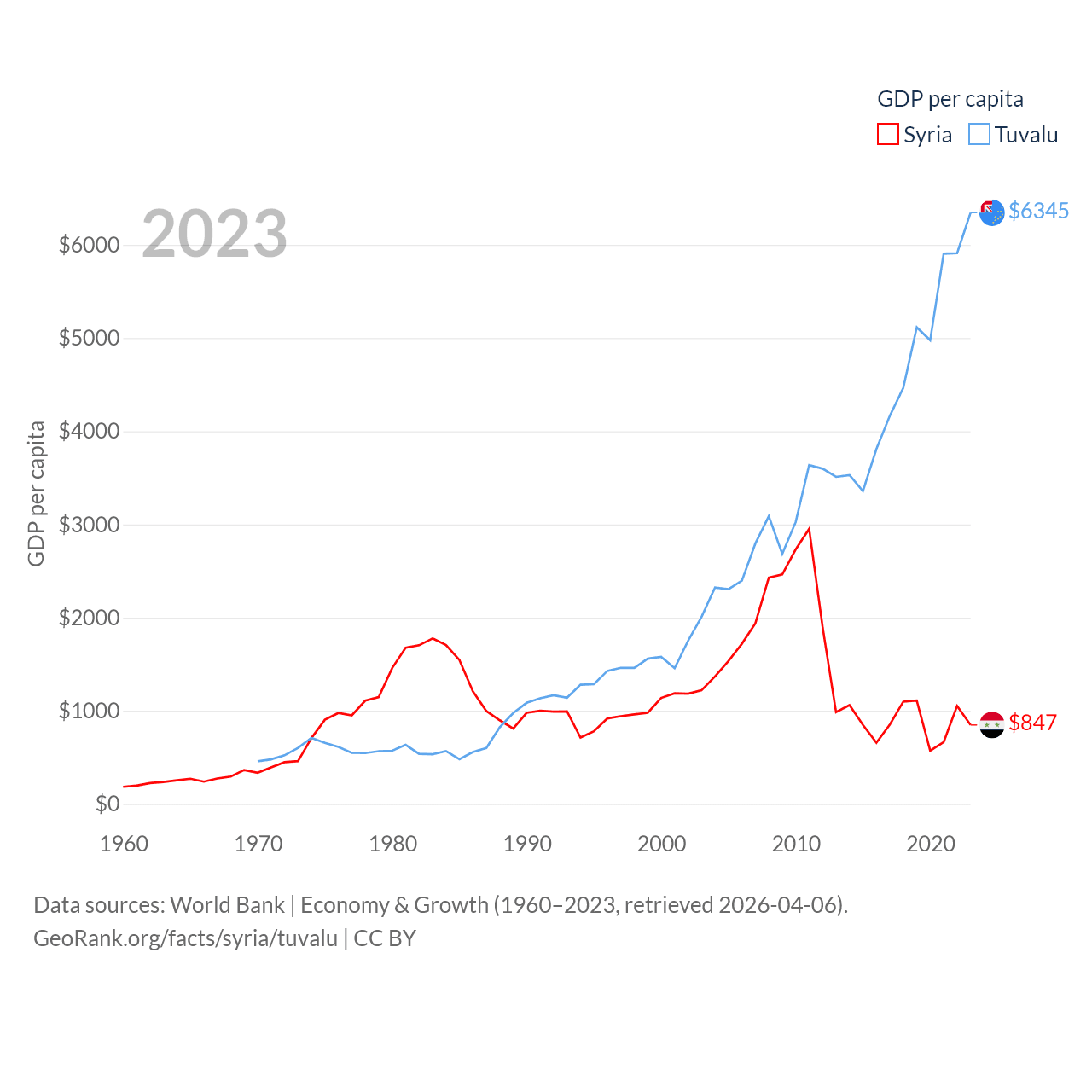 By GDP, Syria ranks 129/197 ($20B) and Tuvalu ranks 196/197 ($62.3M). By GDP per capita, Syria ranks 185/197 ($847), while Tuvalu ranks 110/197 ($6,345).