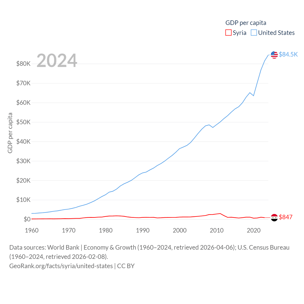 By GDP, Syria ranks 129/197 ($20B) and The United States ranks 1/197 ($28.8T). By GDP per capita, Syria ranks 185/197 ($847), while The United States ranks 10/197 ($84,534).