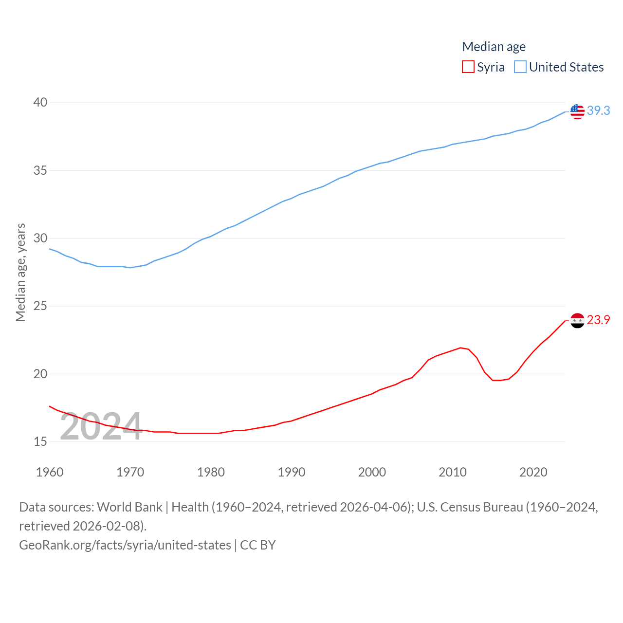 Syria has a population of 24.7M (ranked 57/197), compared with 342M in The United States (ranked 3/197). Syria's land area is 70,900 sq mi versus 3,531,839 sq mi for The United States (ranked 87th vs. 3rd).